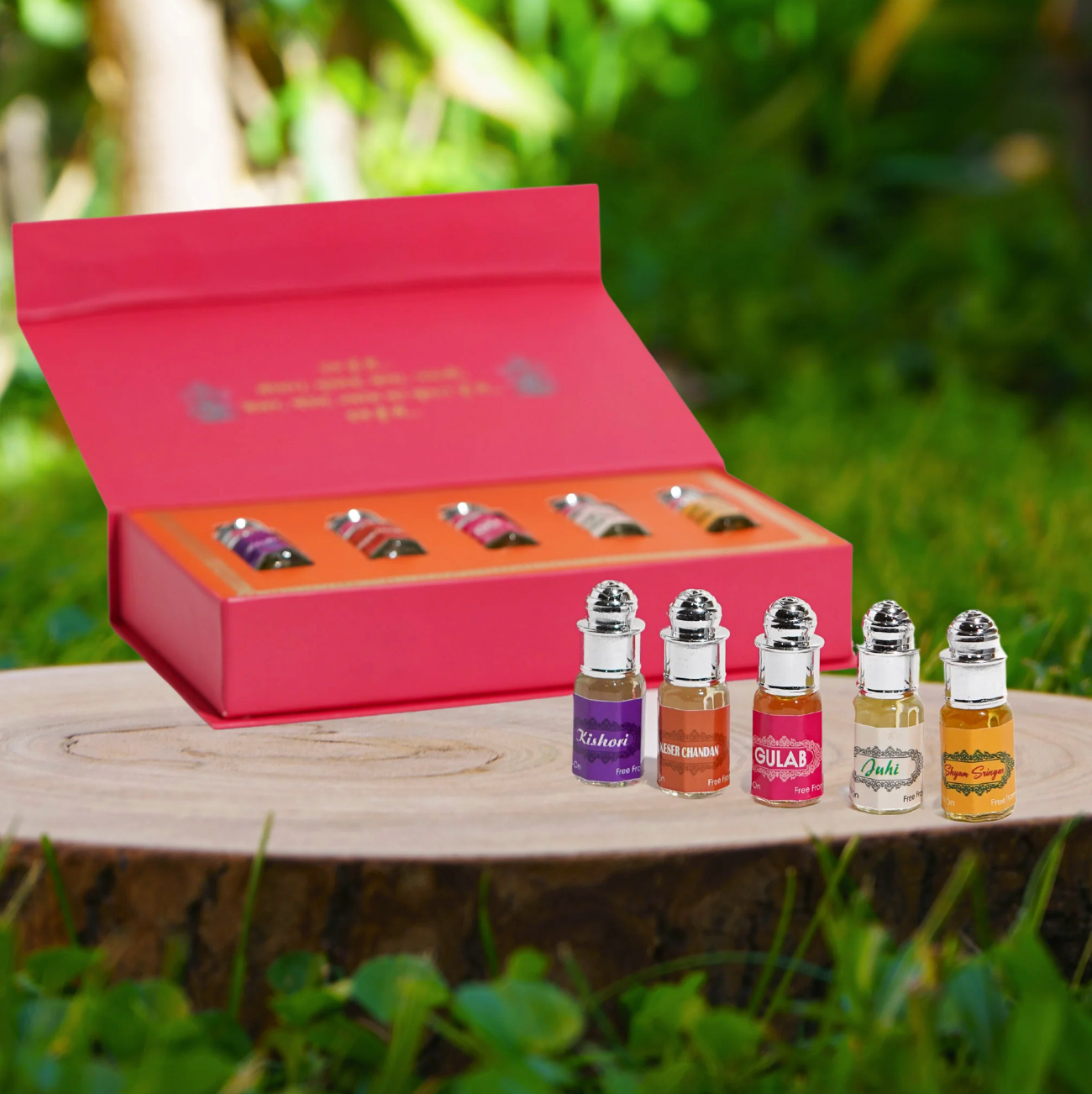 Ingredients: The attars are made using pure and natural extracts. They are 100% alcohol free. The package contains a set of 5 bottles with each bottle containing 3 ml pure attar.