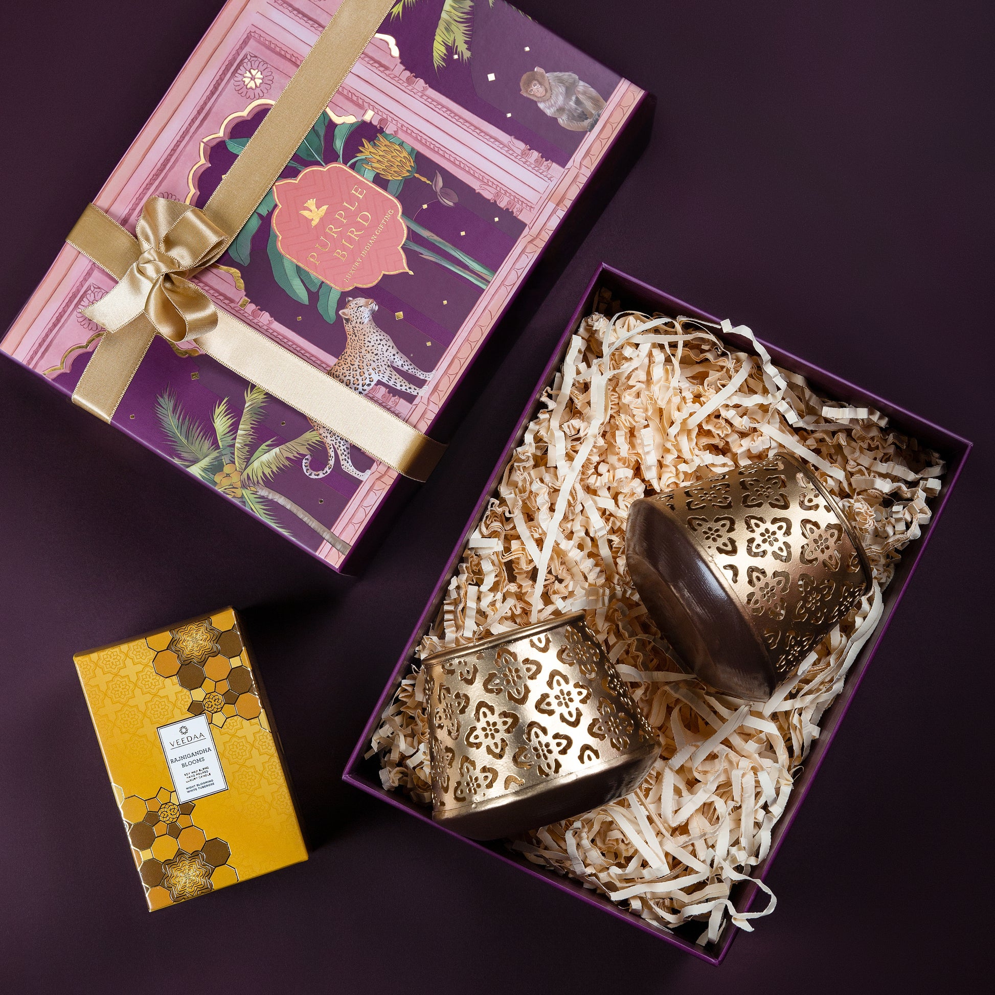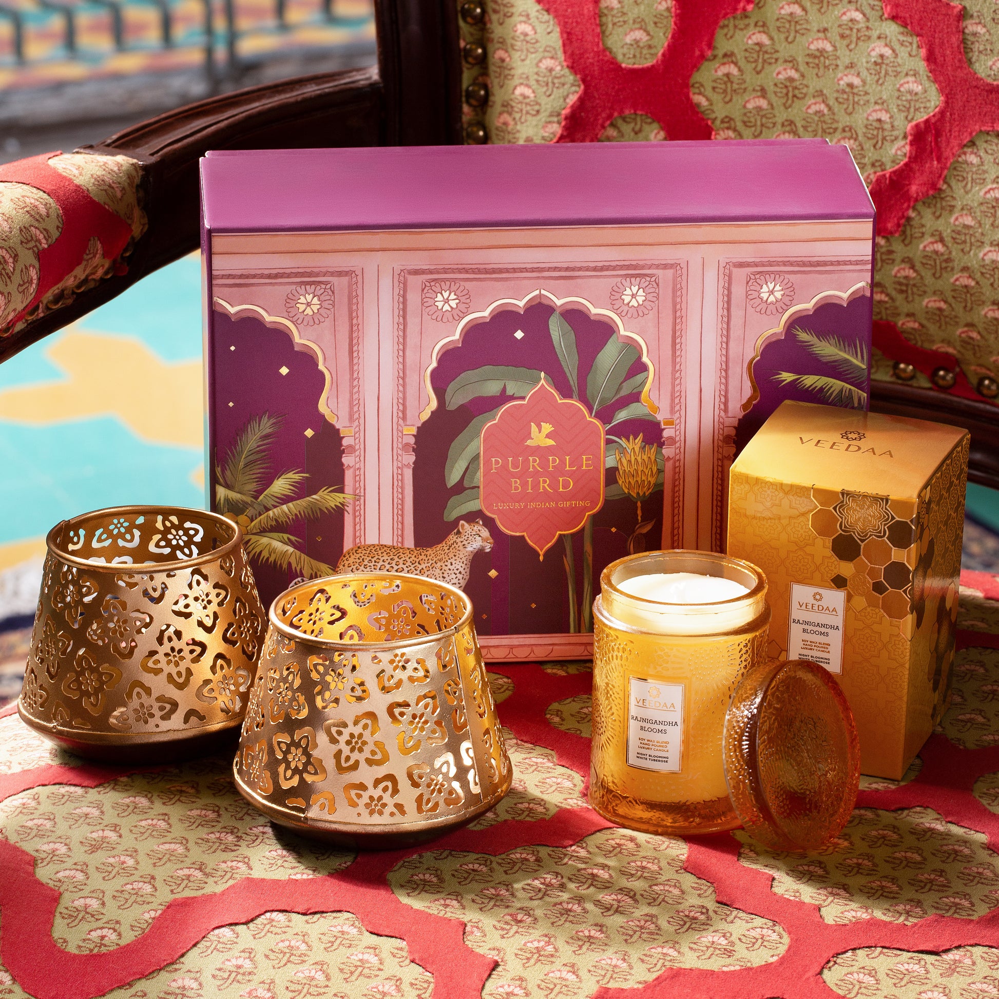 Diwali- a celebration of light, making a fresh start, and new beginnings. No matter how big or small a home may be, we believe in having a large heart. We were raised with the values of adjusting, sharing and above all, loving in full. Give a Diwali gift your loved one the festive season essentials that one can find in every home, and yet one can’t have enough of. A pair of gold coloured tea light holders to brighten any festive setting, along with a candle in an intricate glass jar, to invigorate any space with the divine fragrance of midnight Rajnigandha blooms. The warm, bright glow emitted by tea lights and candles are considered auspicious and represent enlightenment, prosperity, knowledge and wisdom. This curation captures the quintessential festive essence in a box, ready to deliver love and light from yours to theirs, this festive season.