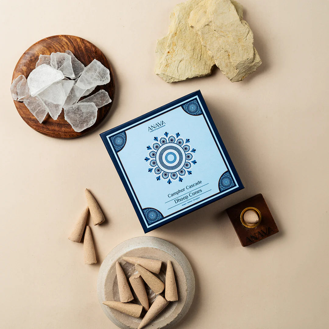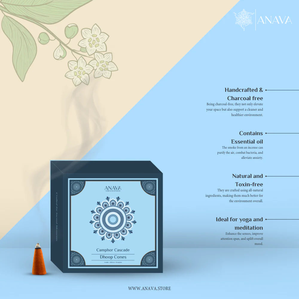 Perfect for those seeking a spiritual or restorative atmosphere, our Camphor Cascade Dhoop Cones bring a serene, healing presence to any setting.