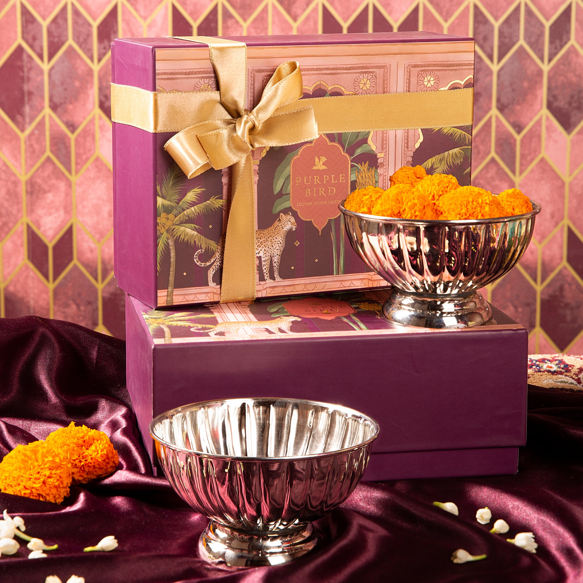 Gift in abundance. The Purple Bird Maharani nut bowls are exquisitely handcrafted in silver-plated brass and are perfect for serving appetizers or snacks including nuts, olives or candy in abundance. The stylish full bodied bowls encapsulate old world charm, with modern day practicality, without compromising on the oomph of luxury serveware. Ideal for festive and corporate gifts, return favours as well as key milestone celebrations. Abundantly gifted!