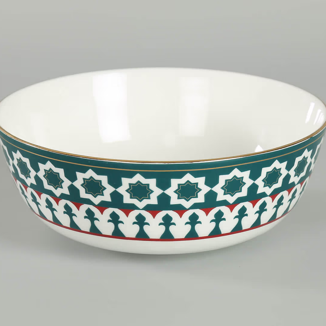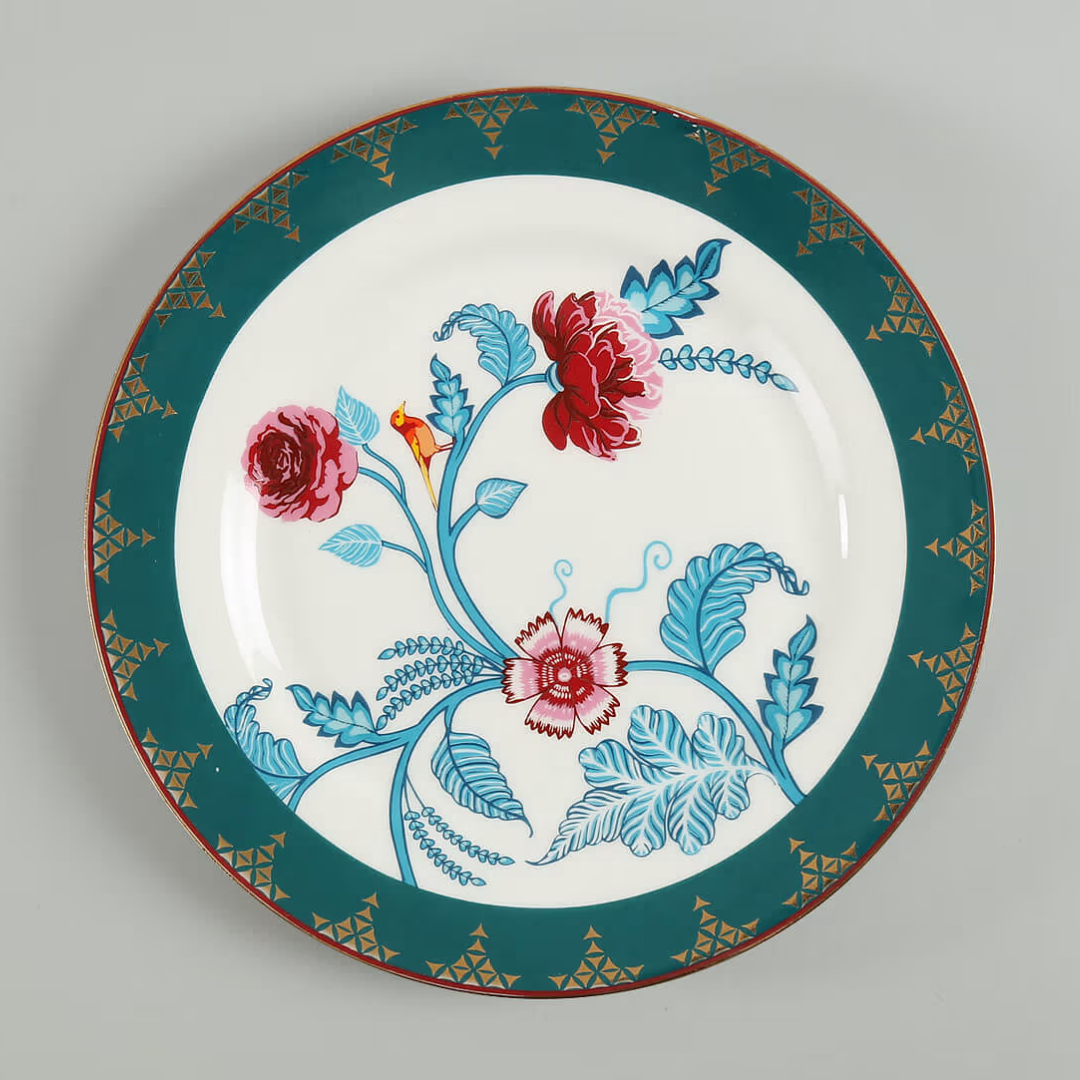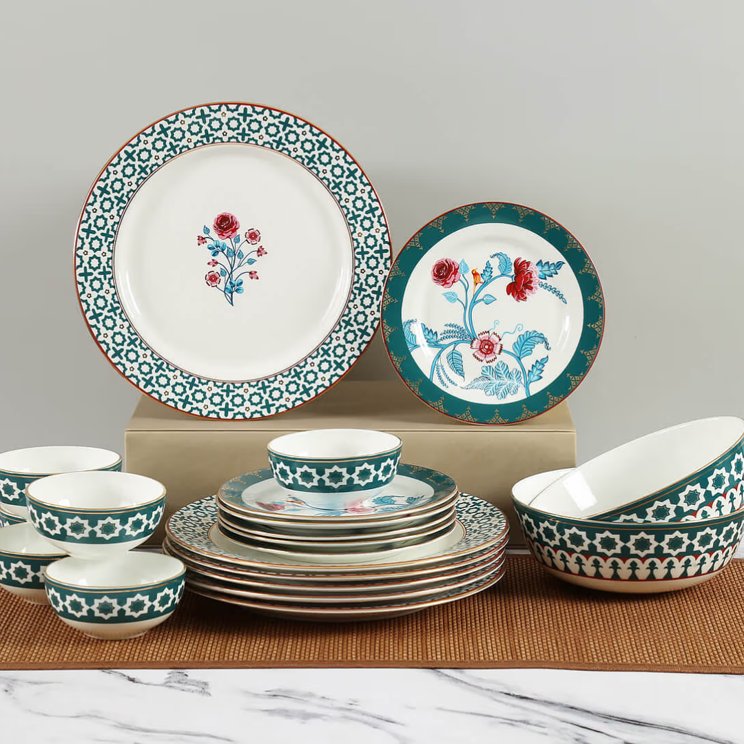 This decorative turquoise dinner set from our limited edition Marine Opulence collection will add a festive vibe to your merriment. Dinner set of twenty pieces (six dinner plates, six side plates, six lentil bowls and two curry bowls) with luxury finish that looks stunning. The design has flowers, sparrows and leaves gallivanting the calm and serene marine background. For more such eye-catching options, check out this special line Marine Opulence at India Circus today.