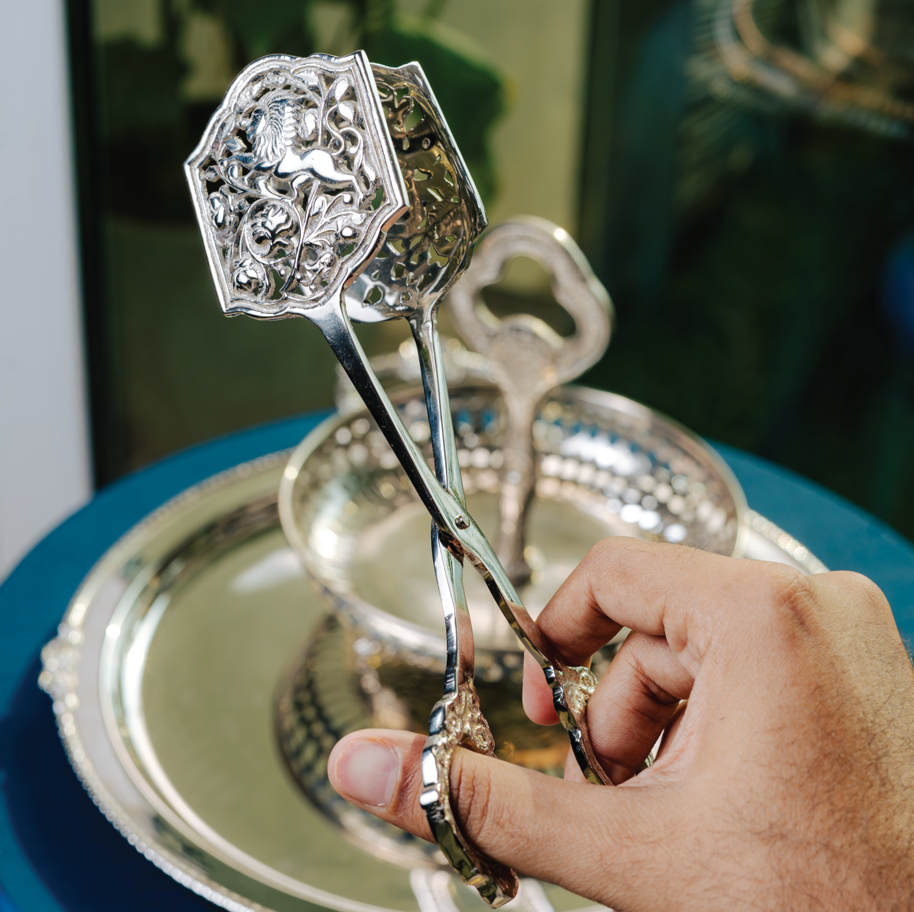 Crafted with functionality and exquisite design in mind, the 'Jungle Raj' silver plated filigree tong will bring an elegant touch to your serveware. This perfectly sized, intricately designed silver plated tongs with floral motifs offers a glimpse of artisanal technique, and is ideal for serving bite sized food, mithai, macaroons, pastries along with cakes.