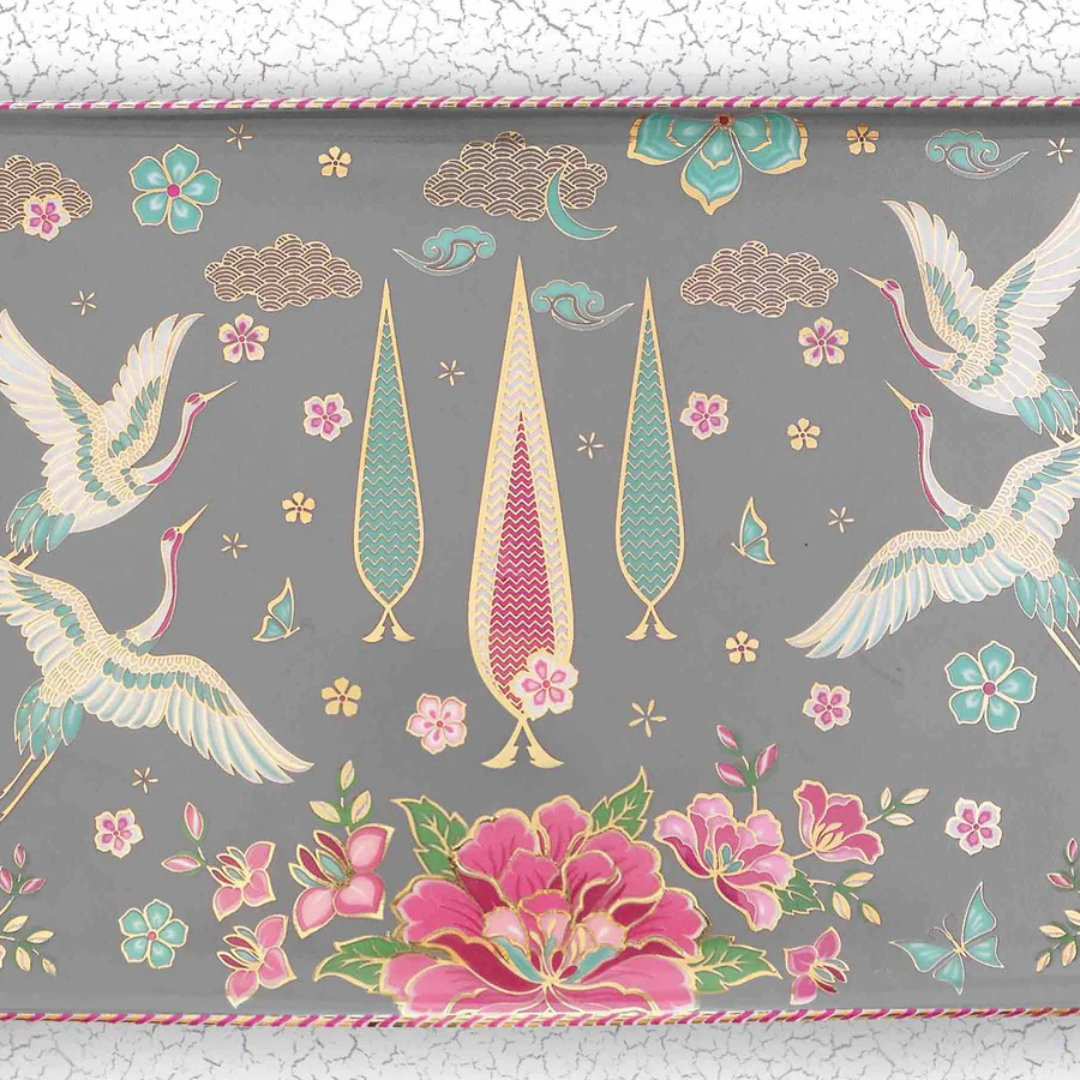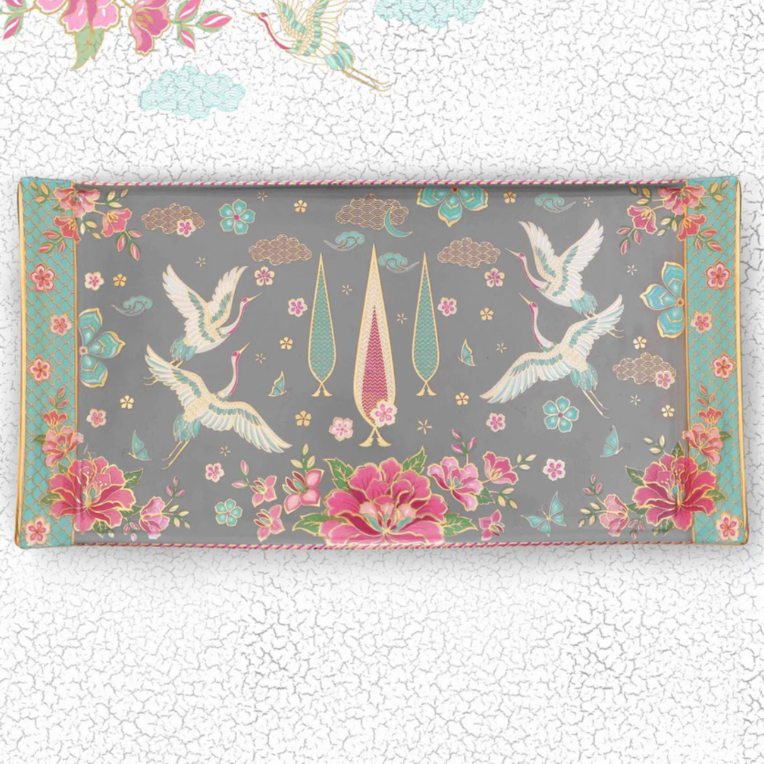 An elegant bone china platter with pairs of cranes courting amidst tall cypress trees, blossoming peonies and delicate wild almond flowers. Intricately detailed with 24 carat gold, it's perfect for serving an array of snacks, desserts and cheeses or simply to be used as a stunning table accessory.