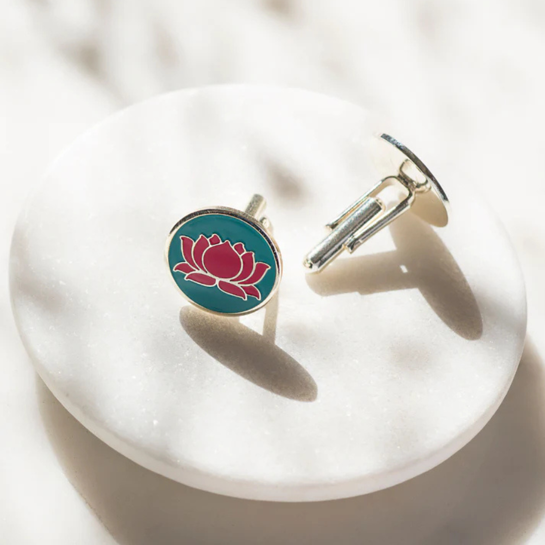 The pure lotus design in teal and pink, crafted from brass with exquisite enameling and silver plating, adds a vibrant touch to your attire.