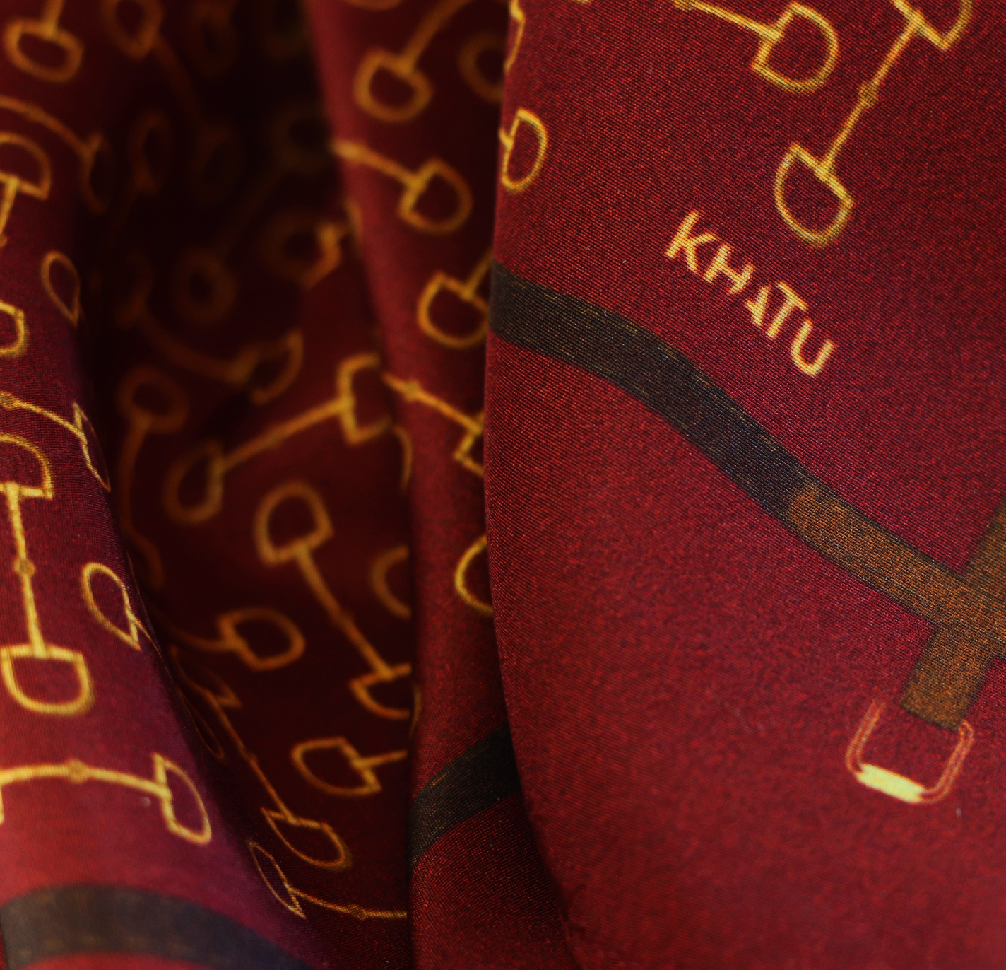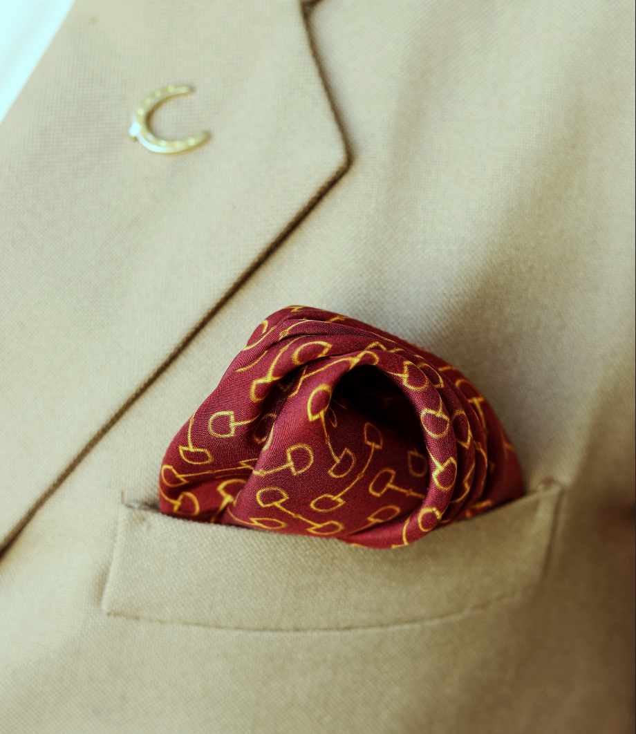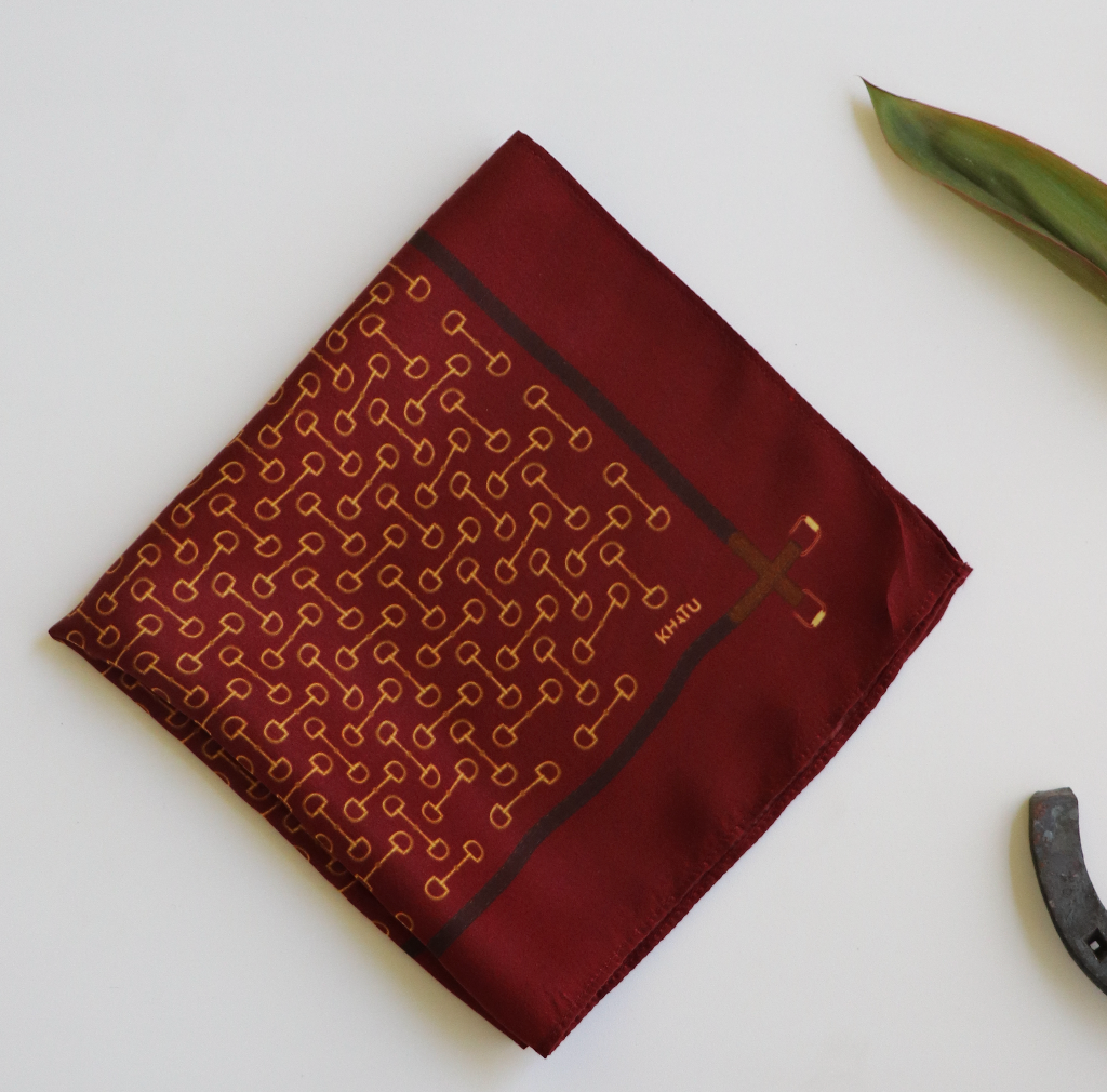 'Snaffle Bit' is a simple yet important element used to equip the horse for riding, its elegant shape has been an inspiration for the print in this smart pocket square in satin silk