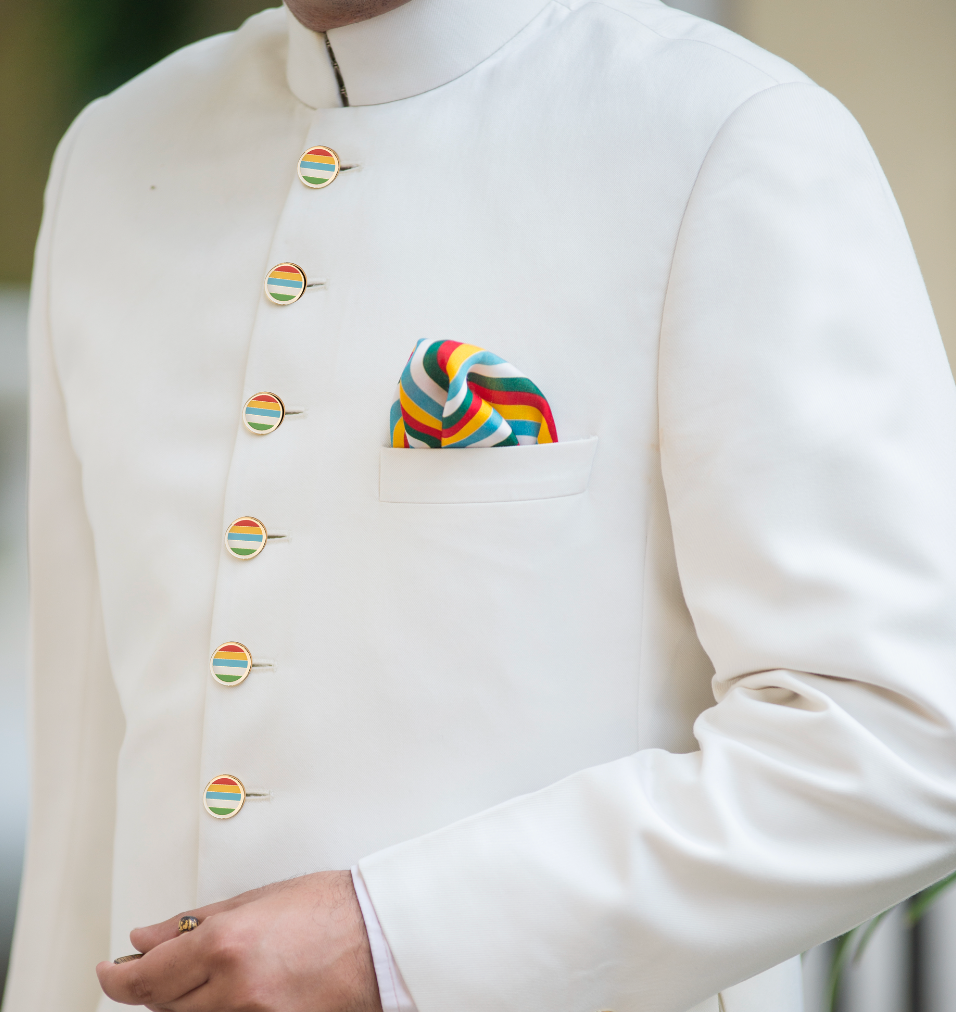 The bright Pachranga colours shine in the pockets to liven up the attire in the pure satin silk pocket square.