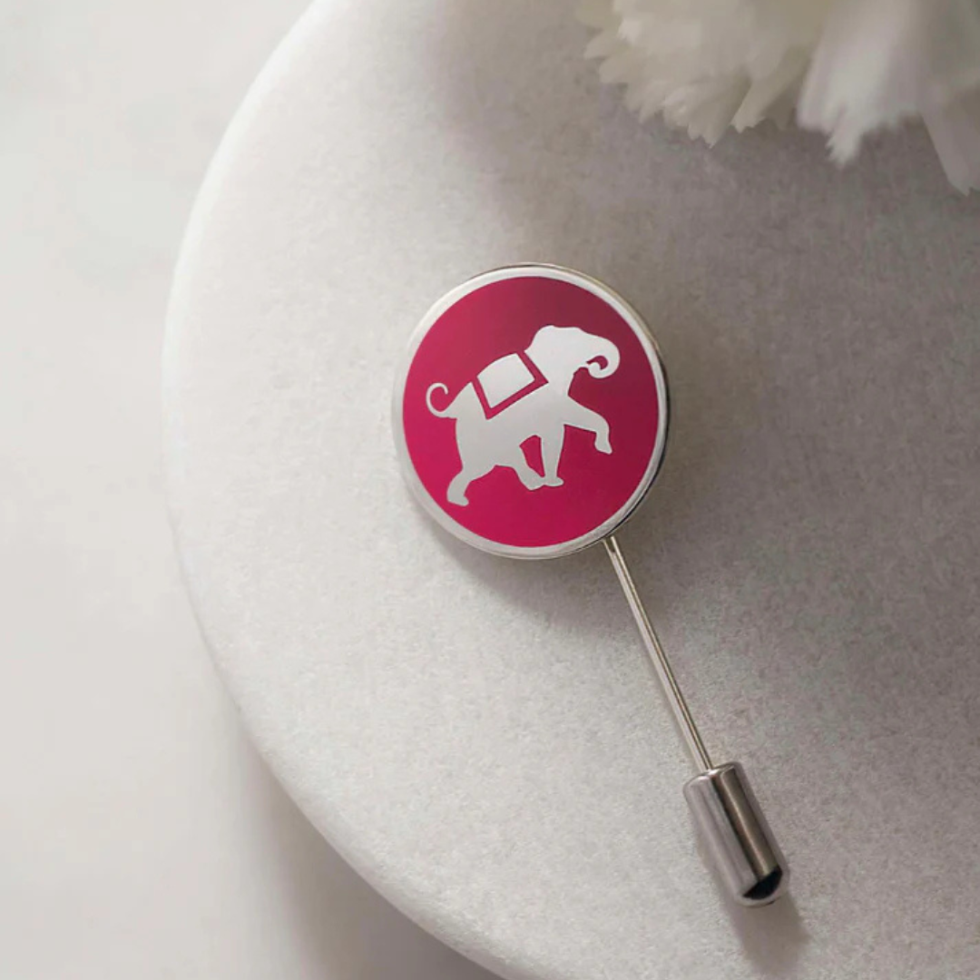 The majestic elephant marches royally in this beautifully crafted lapel pin in brass with silver plating and enameling to adorn the lapels of royal mindsets