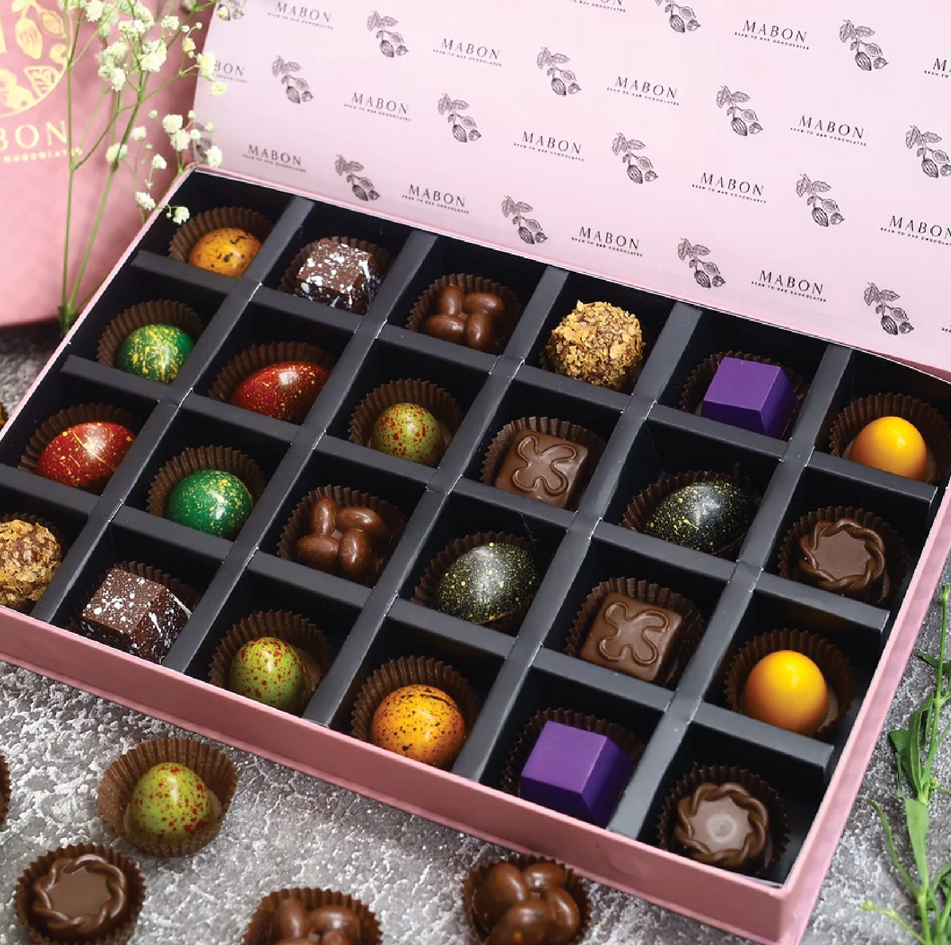 Treat yourself or someone special to our luxurious chocolate bonbon box, featuring two of each, an exquisite selection of indulgent flavours. Flavours include buttery salted caramel, crunchy fruit & nut, smooth hazel bliss, bold coffee bean bliss, zesty orange opulence and creamy hazelnut truffle, nutty peanut perfection, aromatic rose pistachio, fruity raspberry caramel, tropical passionfruit, hazelnut truffle & biscoff cheesecake.