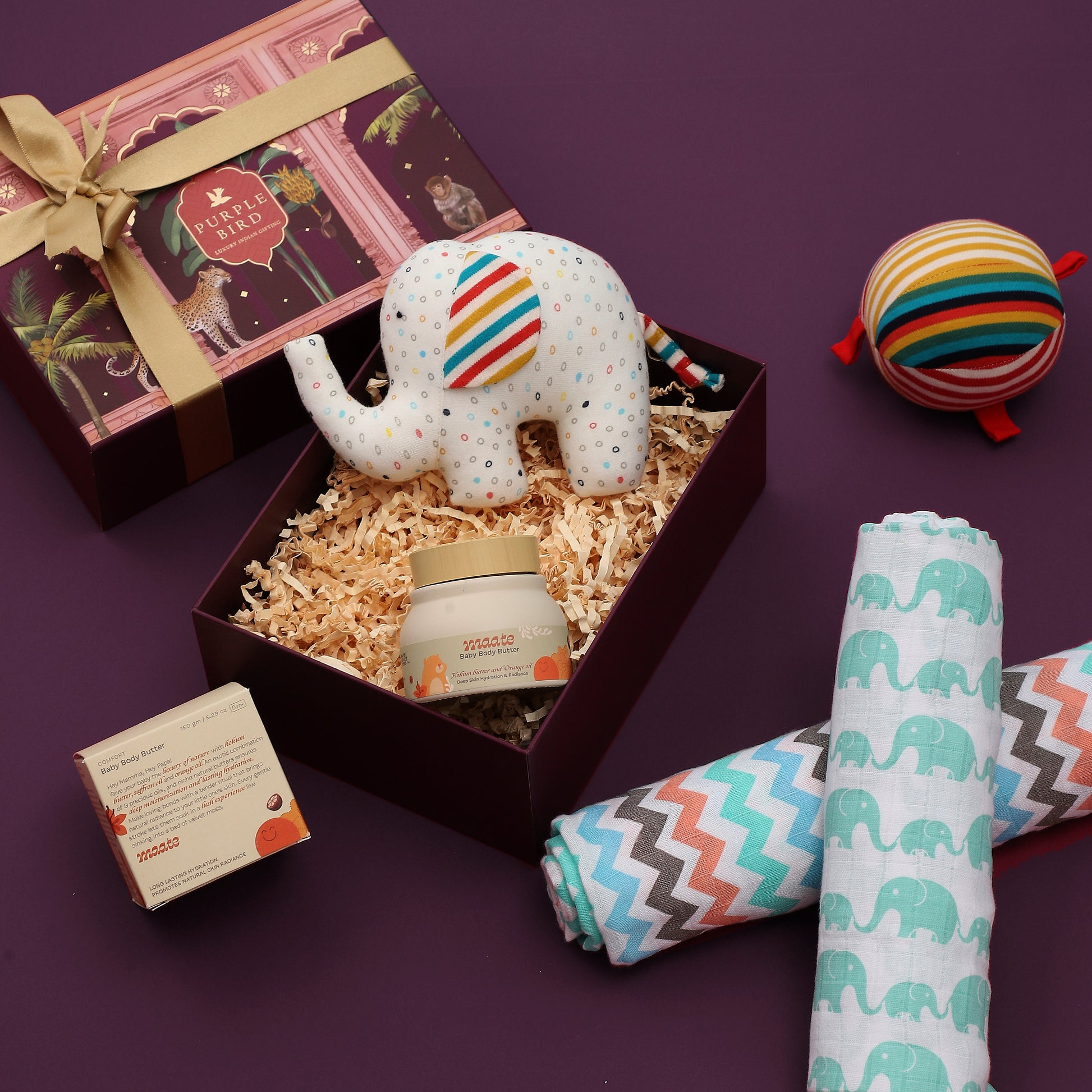 The notion of innocence refers to a child's simplicity, their lack of knowledge, and their purity as they haven't been spoiled by the ways of the world (just yet). Our Nadaan curation brings the best baby products, to celebrate this age of innocence. The natural and vegan body butter with kokum and saffron, protects, calms and invigorates the babys skin. The Ele and Ball have a dual purpose of plush toys and rattles to develop sensory and motor skills - the best first play mates for your baby. Surround the baby in the comfy goodness of a pair of organic muslin swaddles with the adorable elephant parade design. Here's to the wise, innocent ones! Jeetay Raho.