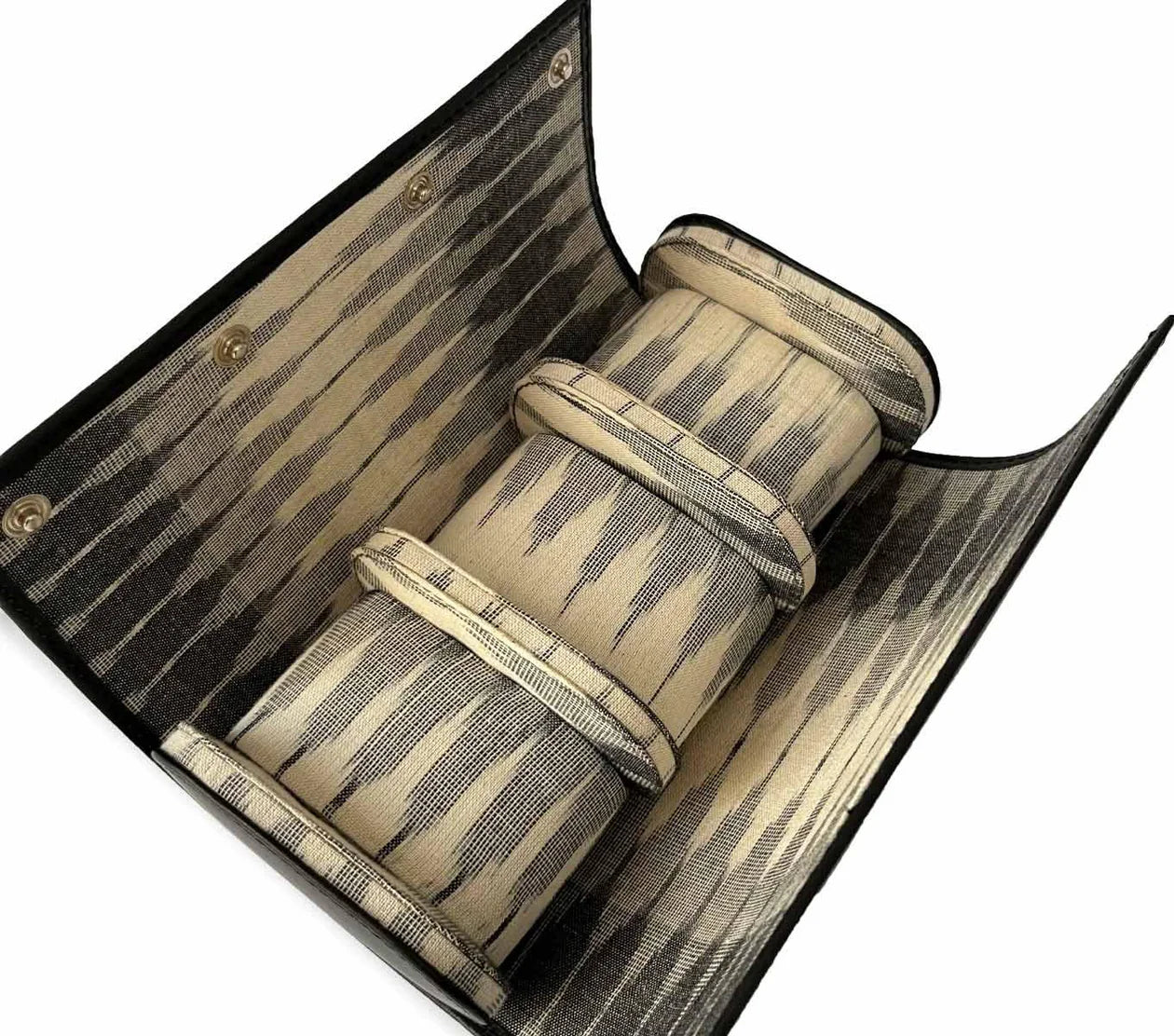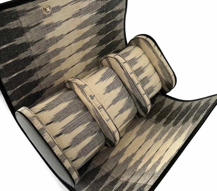 Encase your beloved watches in our new Multi watch case, handcrafted in genuine leather with a handwoven ikat lining as well as gentle padded cushioning to protect your watch from scratches, and is equipped with snap buttons for ease of closure. The watch case is designed to organize multiple watches.