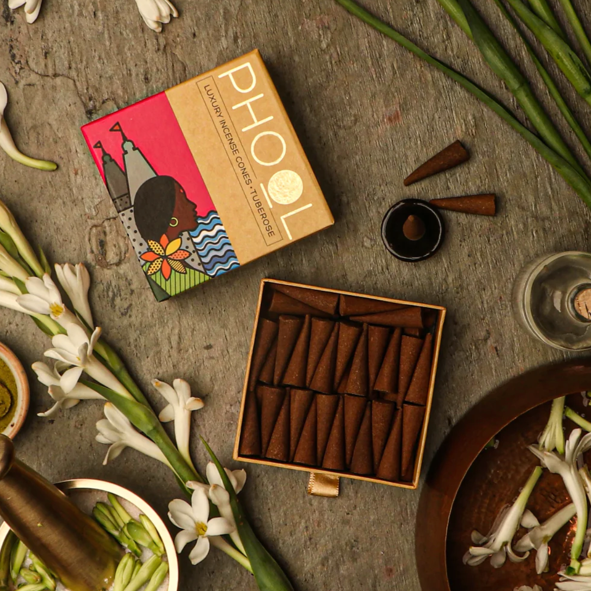 Made from sacred temple flowers and 100% natural essential oil, the Phool natural incense cones have been hand-rolled by our women flowercyclers and are safe, healthy and the best stress-relievers. The luxurious fragrance of Phool Tuberose Incense Cones will provide a unique sumptuous aroma to your home. Widely used in aromatherapy treatment. It has a sweet floral fragrance and is also commonly used for aromatherapy, home fragrance and meditation. Each box contains 40 Incense Cones and an oven-baked clay Incense holder. Each cone is 3.5cm long, having a long burning time of 30-35 minutes.