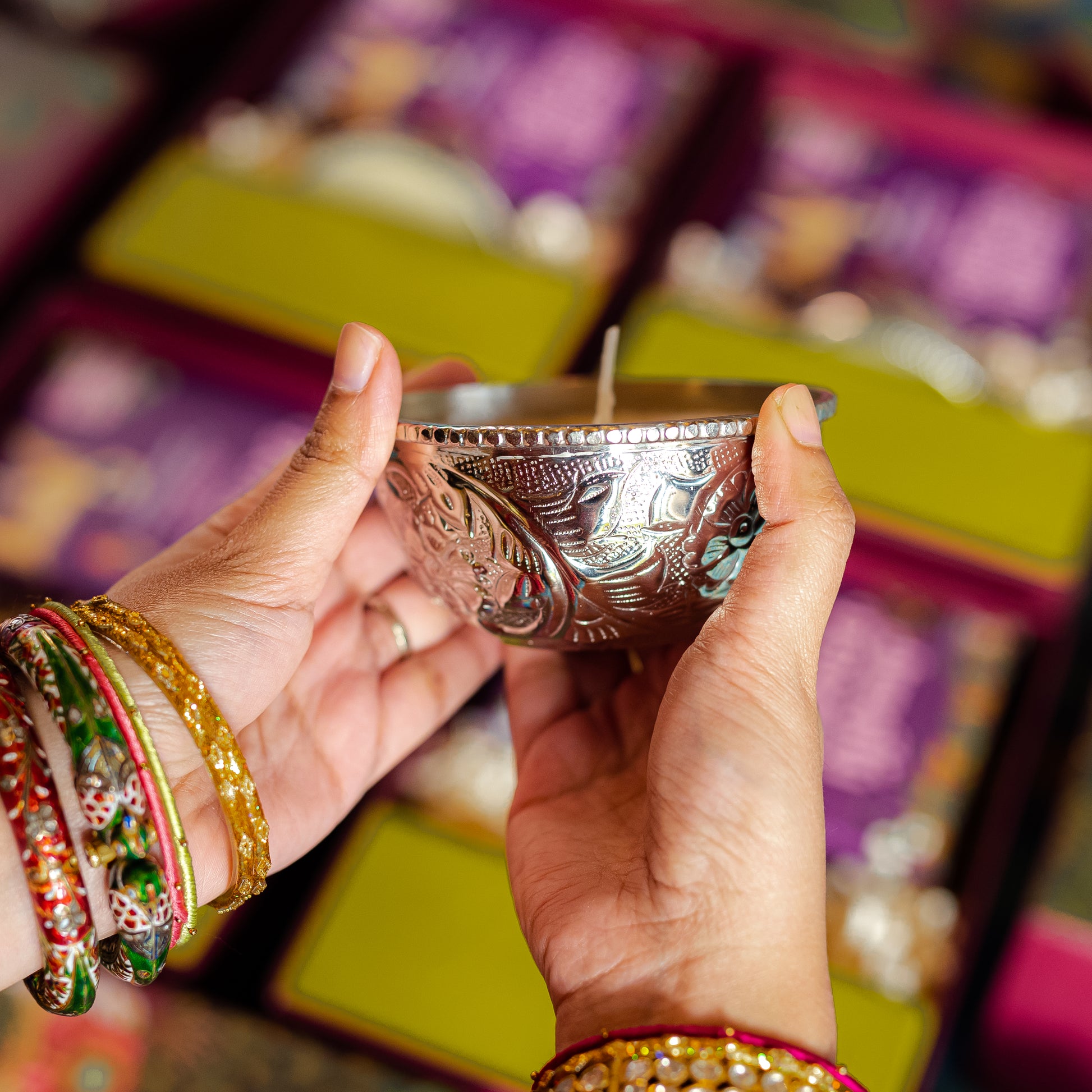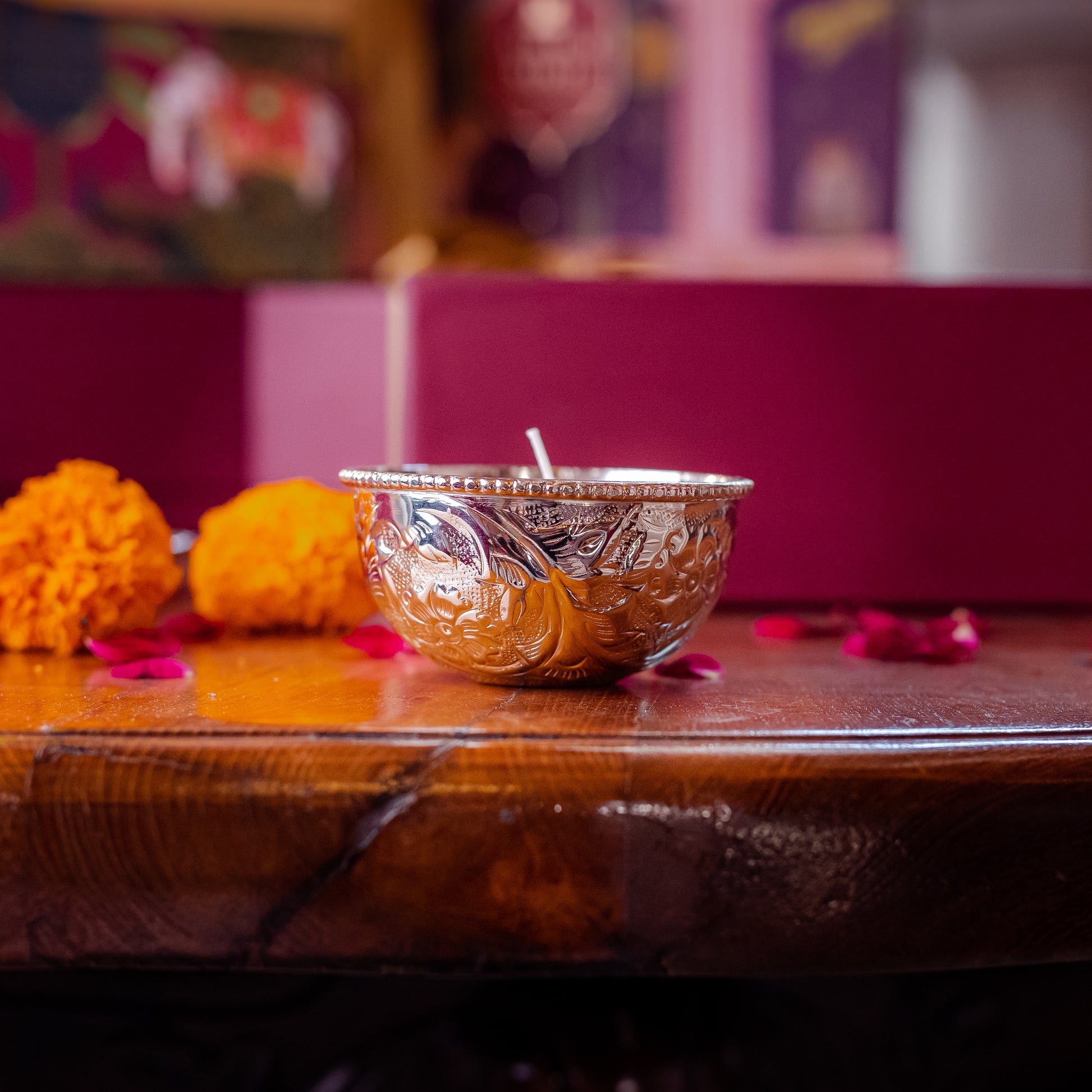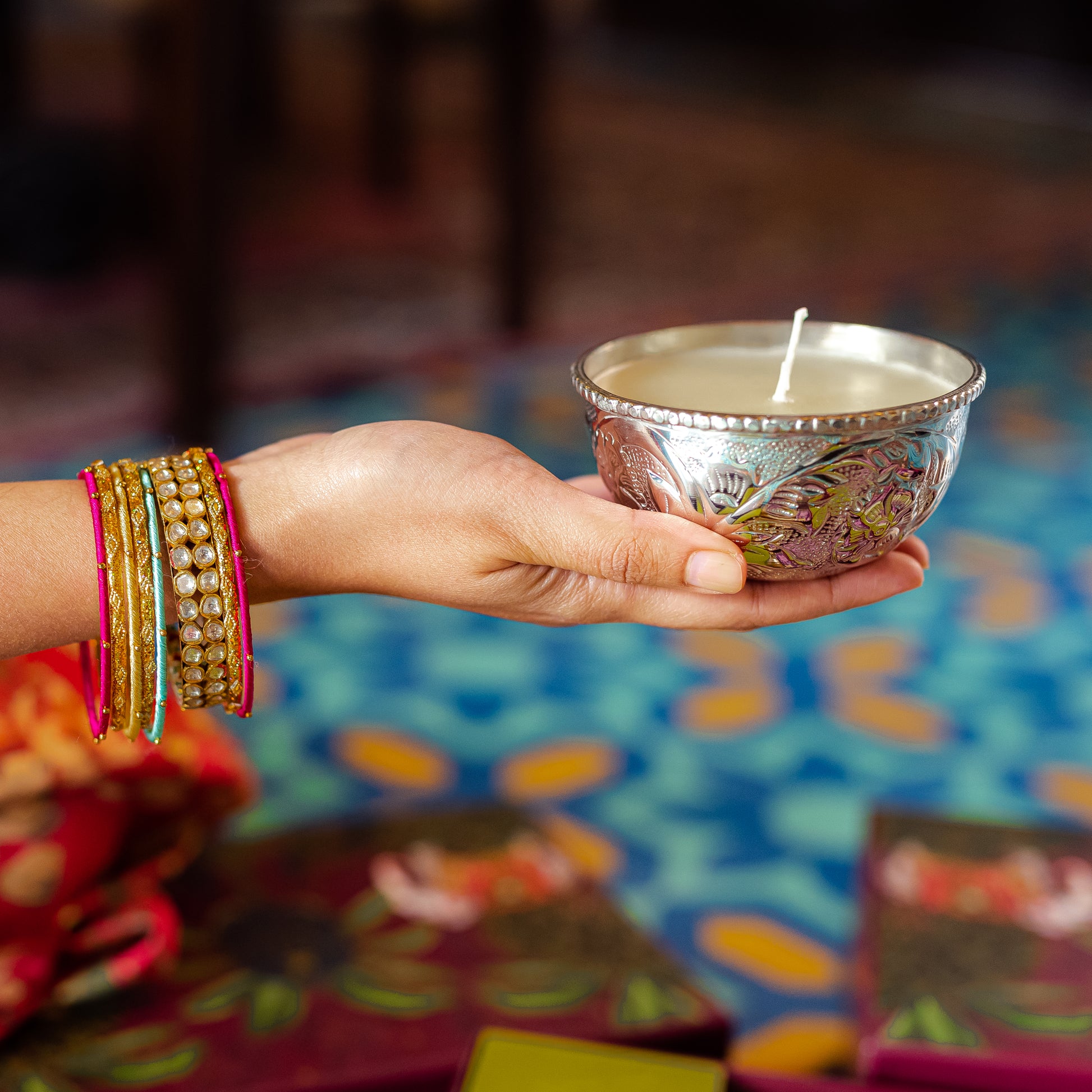 A glowing silver plated, lightly fragrant rose candle, is sure to uplift the mood in any setting. Create a corner of warmth and envelope your home with these embossed candles, designed with floral motifs. The Baagh candle boasts of an ornate design, lightly fragrant of roses. Among our most popular designs, the Baagh candle will remind your gift recipient of you, as it rests on their bedside or coffee table. Disclaimer: You maybe tempted to keep the Baagh candle for yourself.