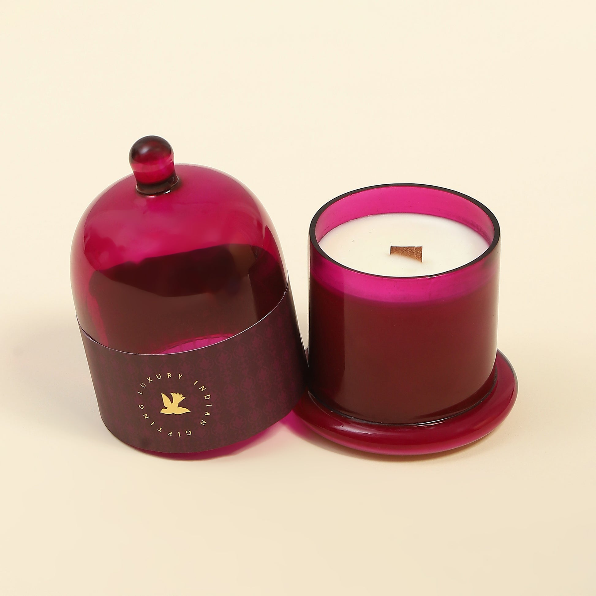Design: Purple Glass Container with Cloche Lid. Lift the cloche to experience the tantalizing fragrance of Calcutta Cocktail.
