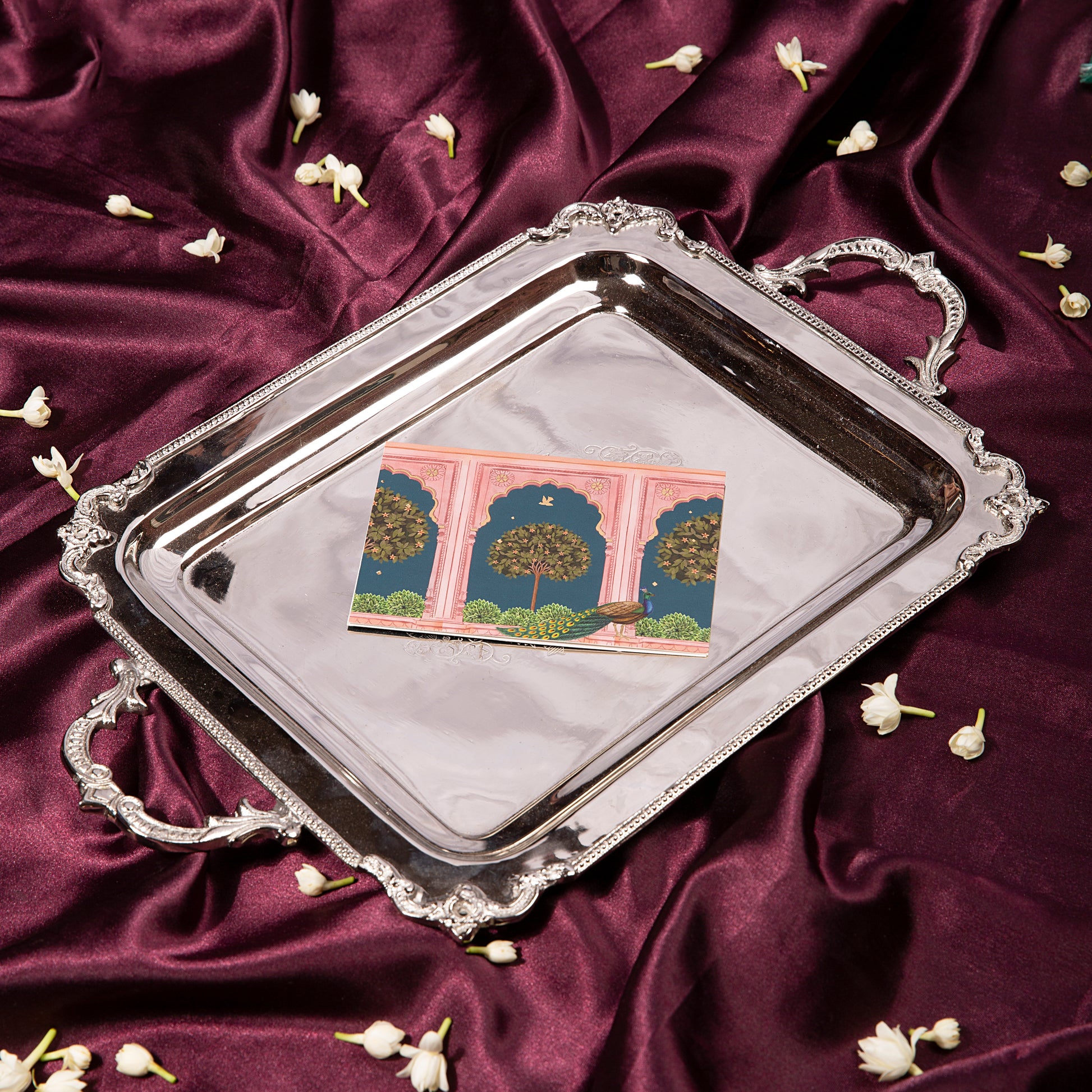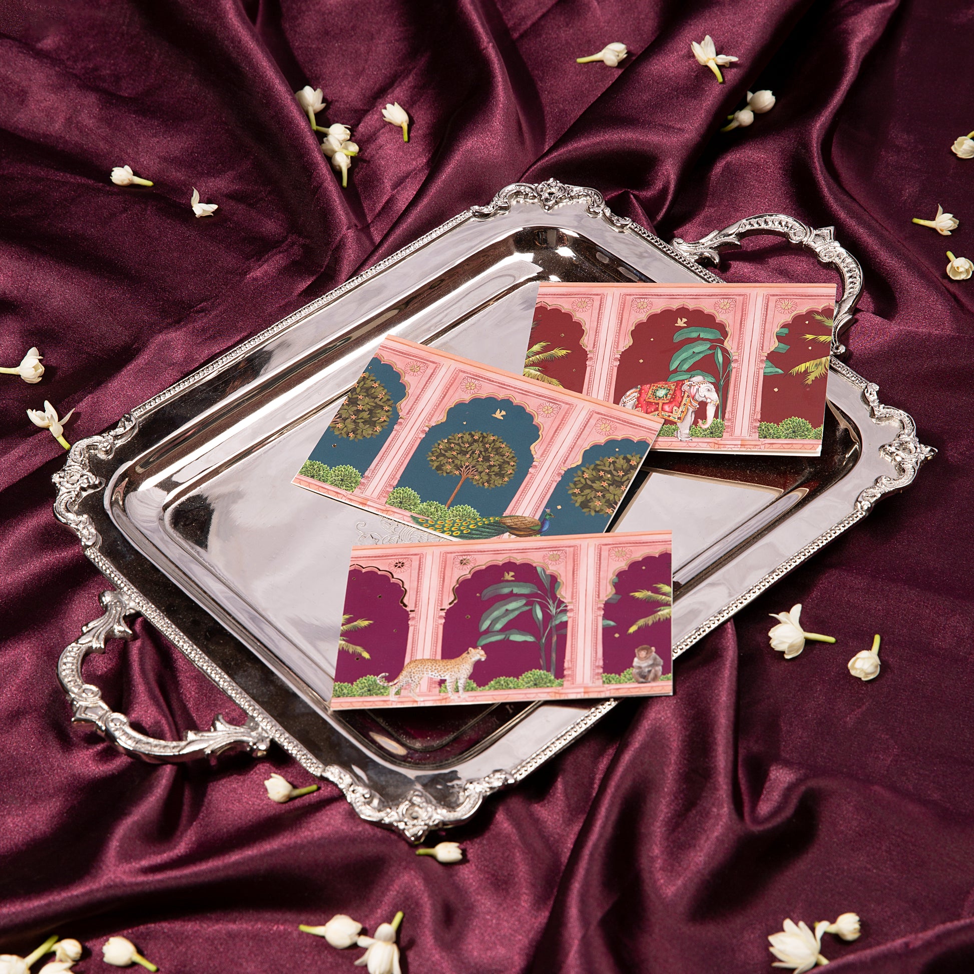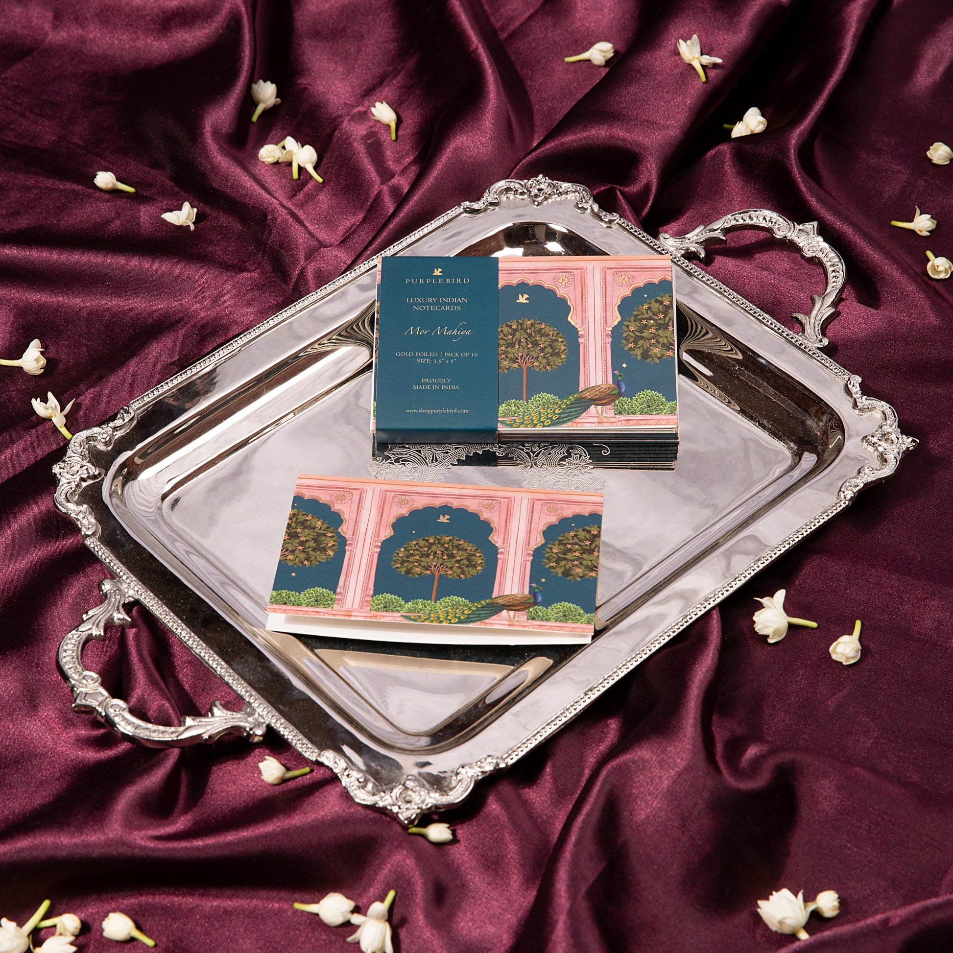 Make a bold statement with the gold-foiled 'Mor Mahiya' notecards, decorated with a beautiful garden with lush trees, capturing the joy of the Indian peacock after rain, set against a royal Indian backdrop. A premium quality notecard for your thoughtful message. A symbol of power and beauty with design details that give it that luxurious elegance.