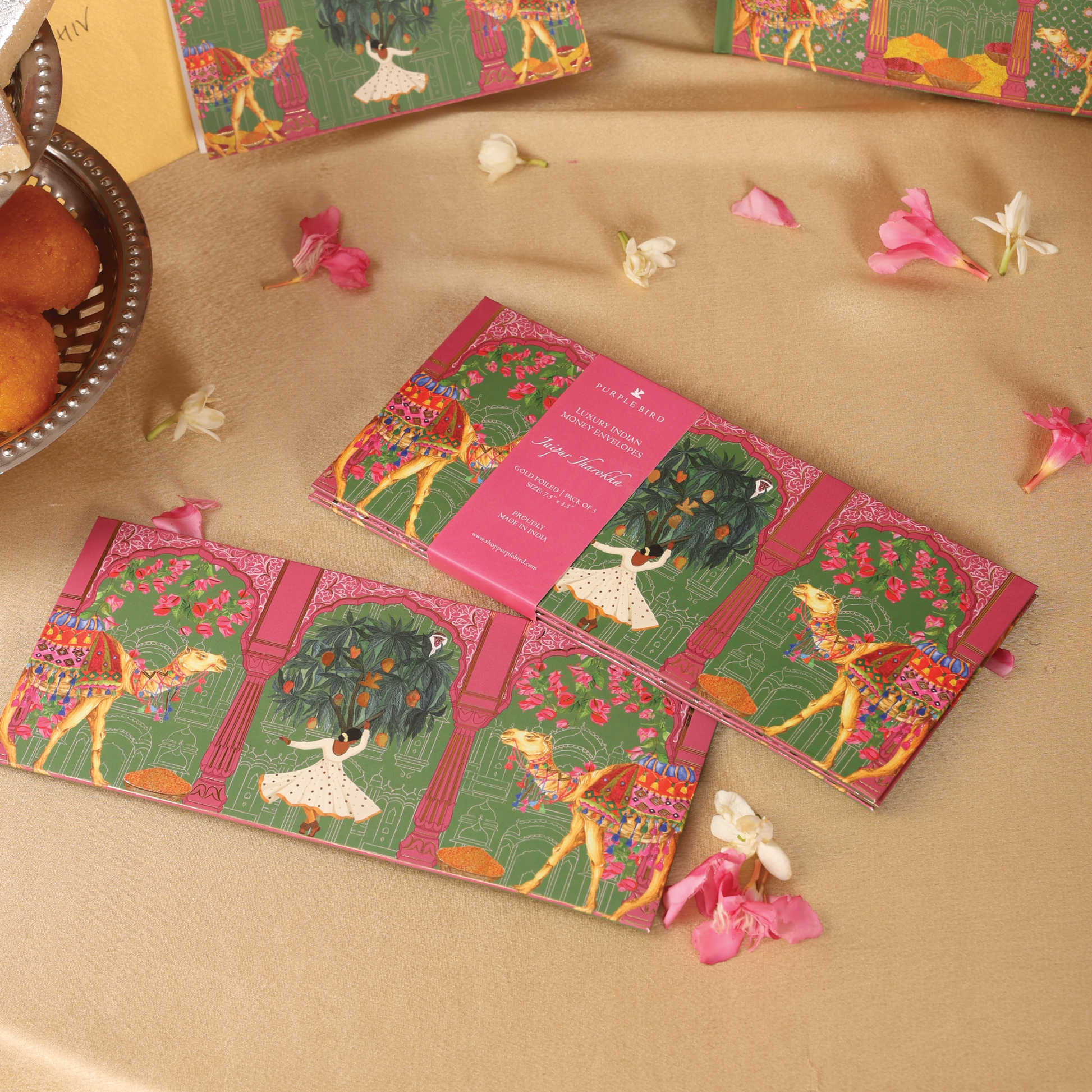 Now reimagined as a set of 5 premium money envelopes — printed on luxurious textured paper and finished with gold detailing. A beautiful way to gift blessings, love, and a touch of royal India.