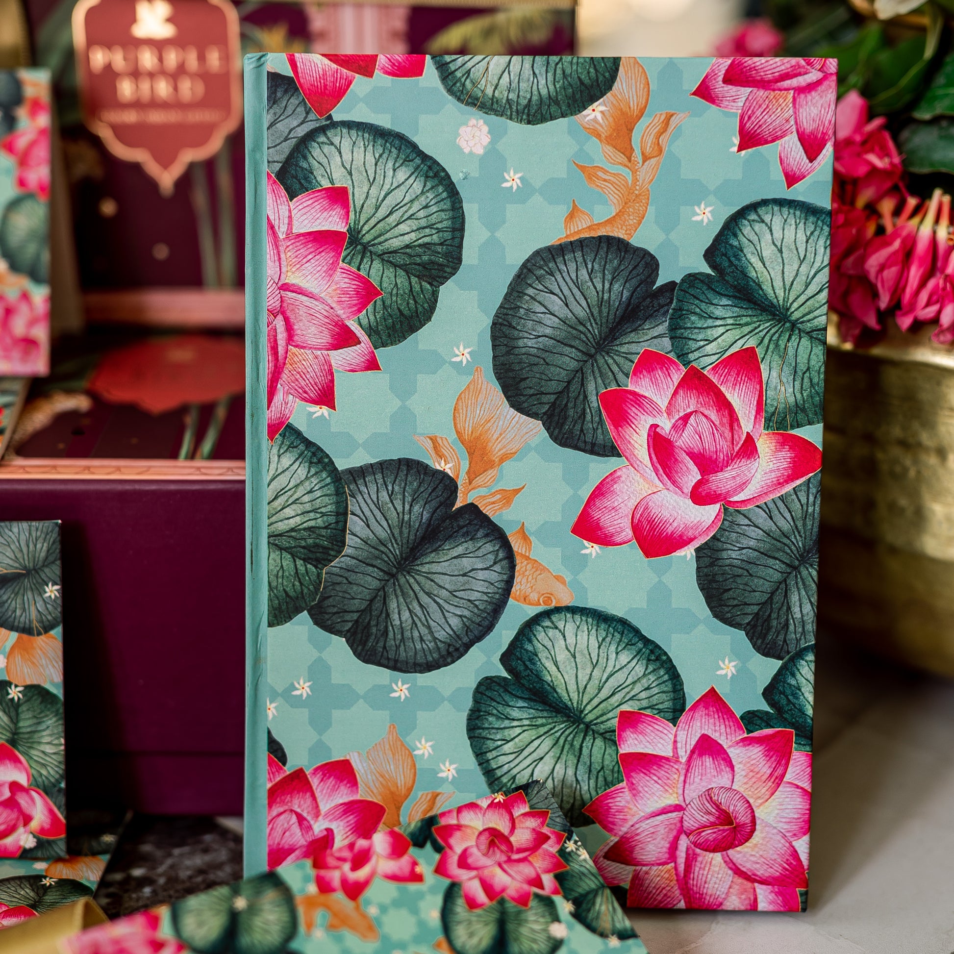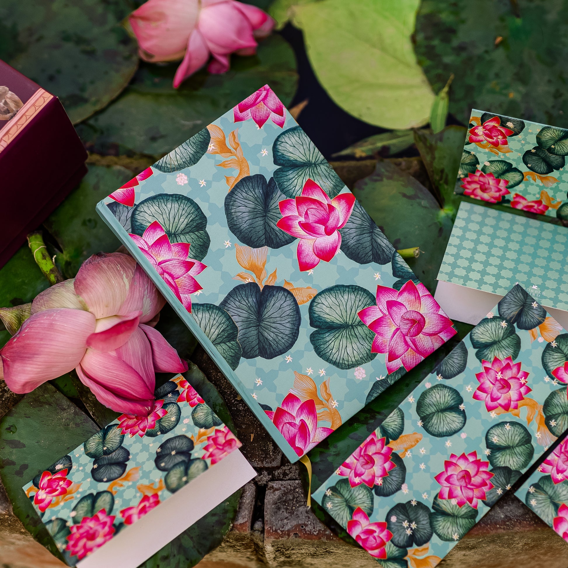 Unveil the essence of royalty with Khilta Kamal, your gateway to the opulent world of Indian heritage. Our exquisite notebook, adorned with intricate gold foil detailing, pays homage to the grandeur of India's palace culture. Immerse yourself in the serene beauty of a serene pond adorned with blooming lotus and graceful koi fish. Let each stroke of your pen evoke the elegance of tradition and the richness of history. Experience luxury redefined with Khilta Kamal.