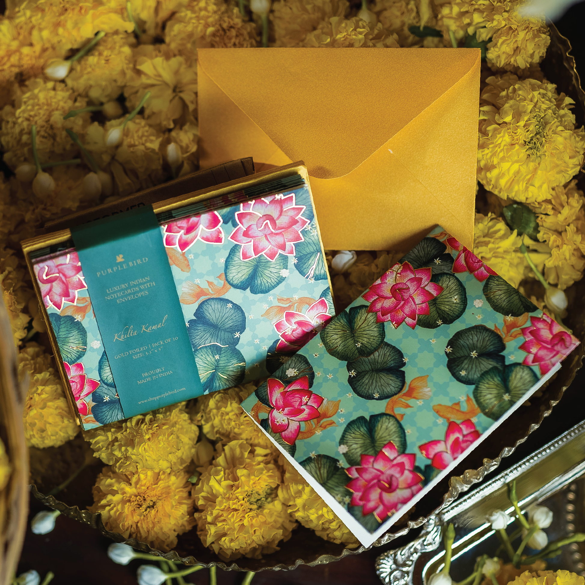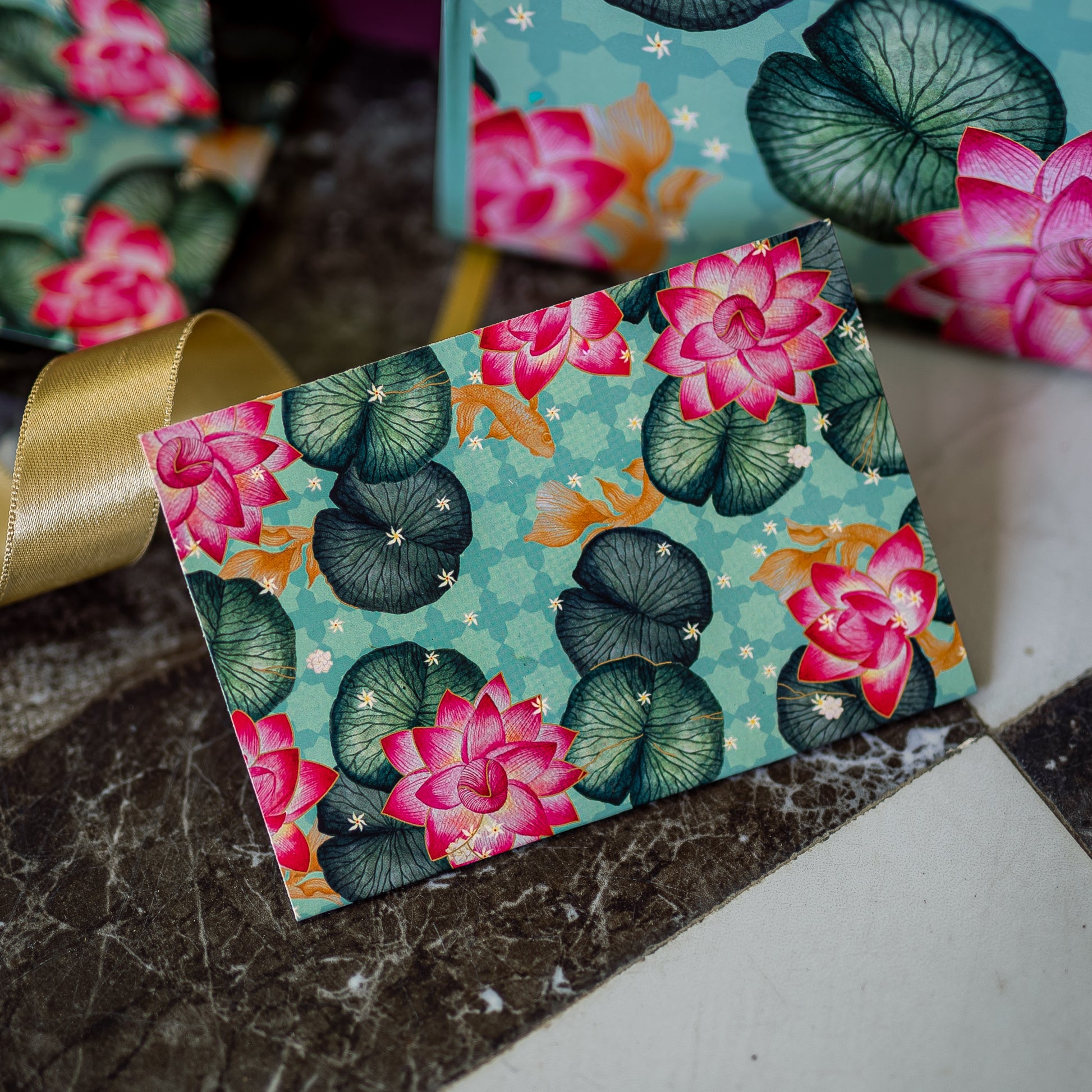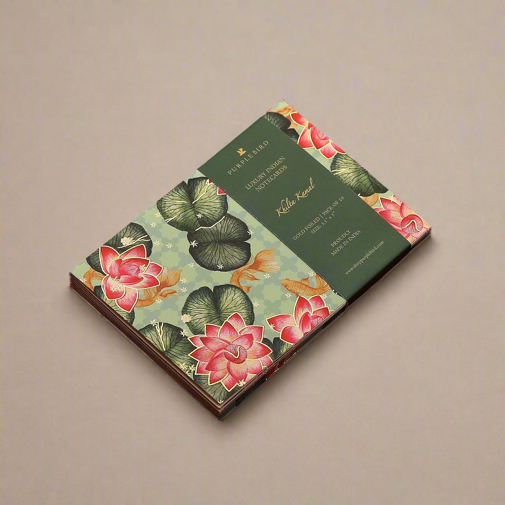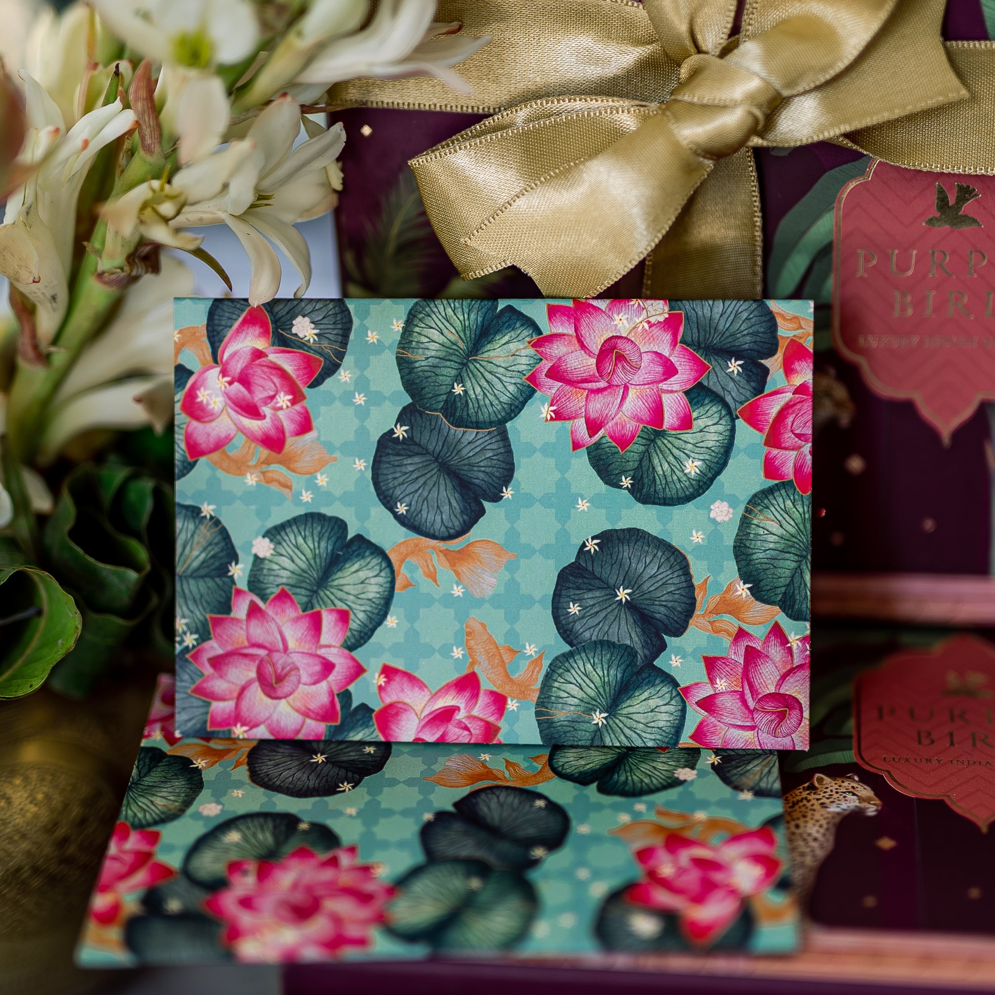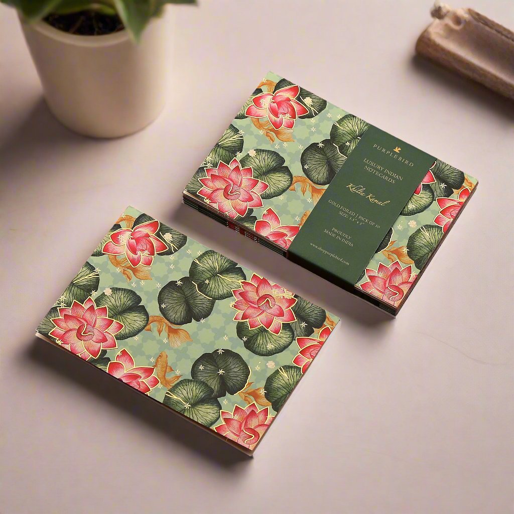 Send your sentiments with a touch of regal elegance using Khilta Kamal notecards. Adorned with the exquisite design of a lotus pond and majestic koi fish, each card reflects the splendor of India's palace culture. Let your words flow with grace and beauty, carried on the wings of tradition and heritage. Elevate your correspondence with Khilta Kamal notecards, where every message becomes a work of art.