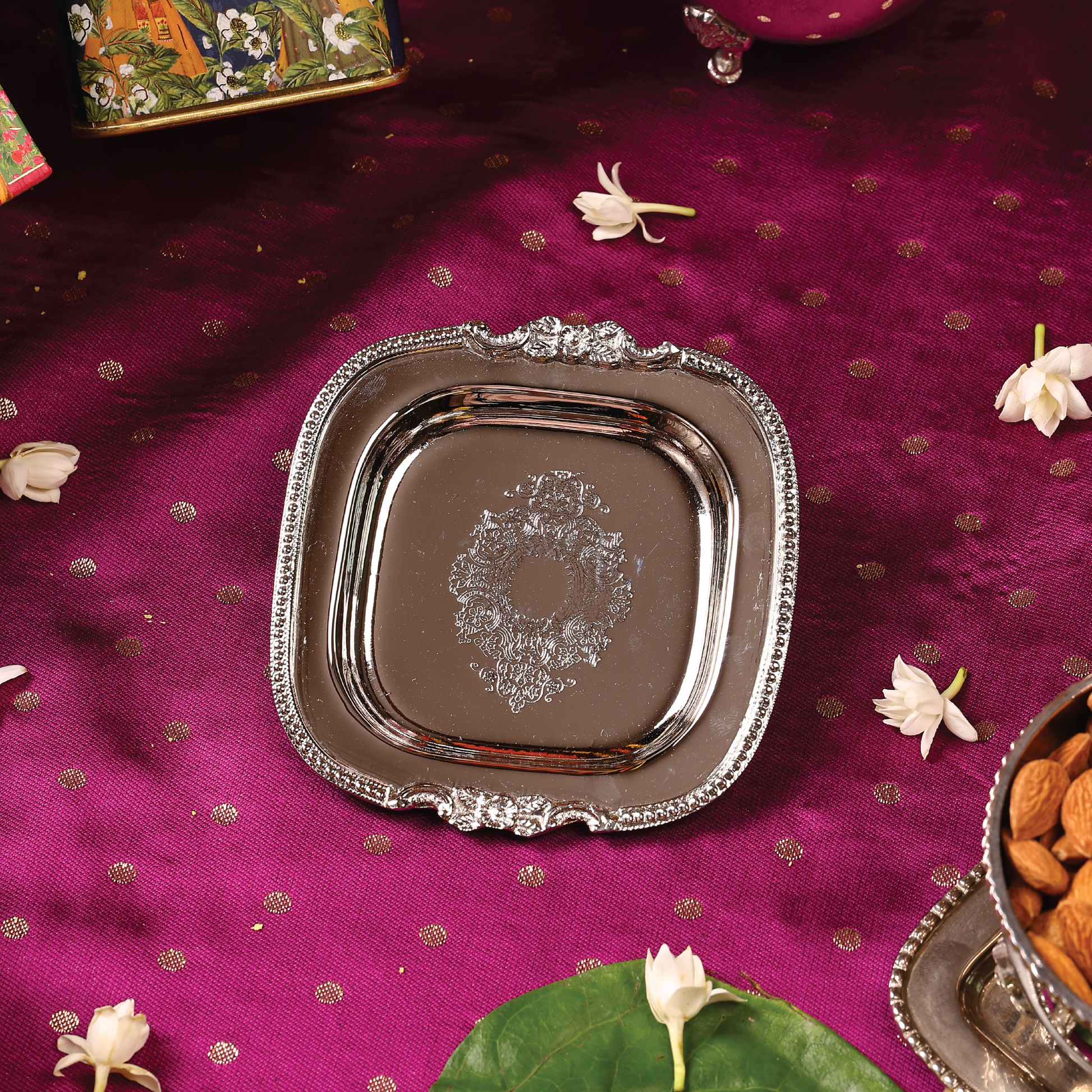 Celebrate timeless artistry with the ‘Seva’ Silver-Plated Mini Coaster Tray/Jewlry Holder, a piece that blends old-world charm with intricate craftsmanship. Featuring an embossed emblem, delicate etching, and decorative handles, this petite tray is perfect for serving a pair of glasses, holding coasters, or presenting small treats and keepsakes. Compact yet ornate, it brings elegance to intimate gatherings or makes a thoughtful, giftable accent.