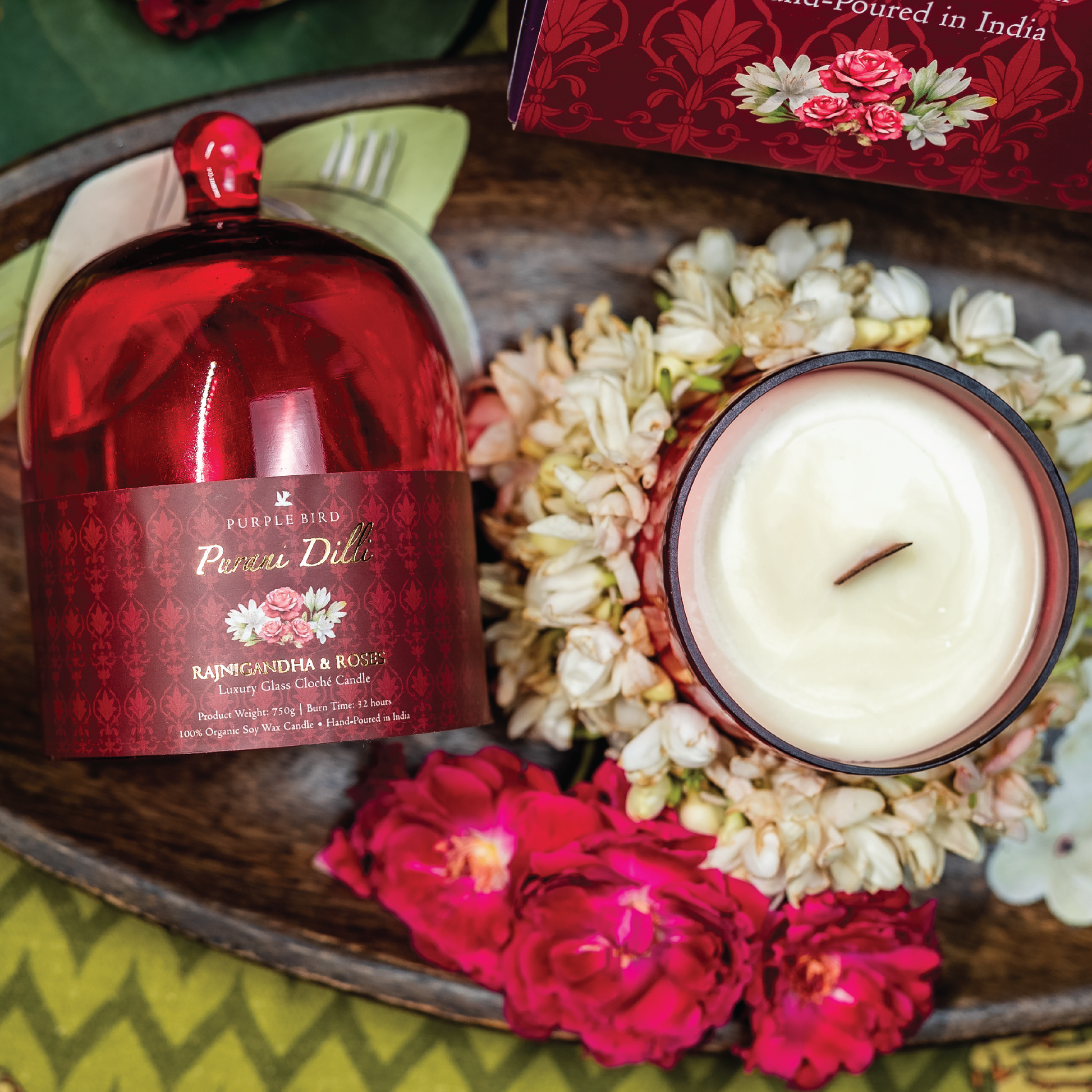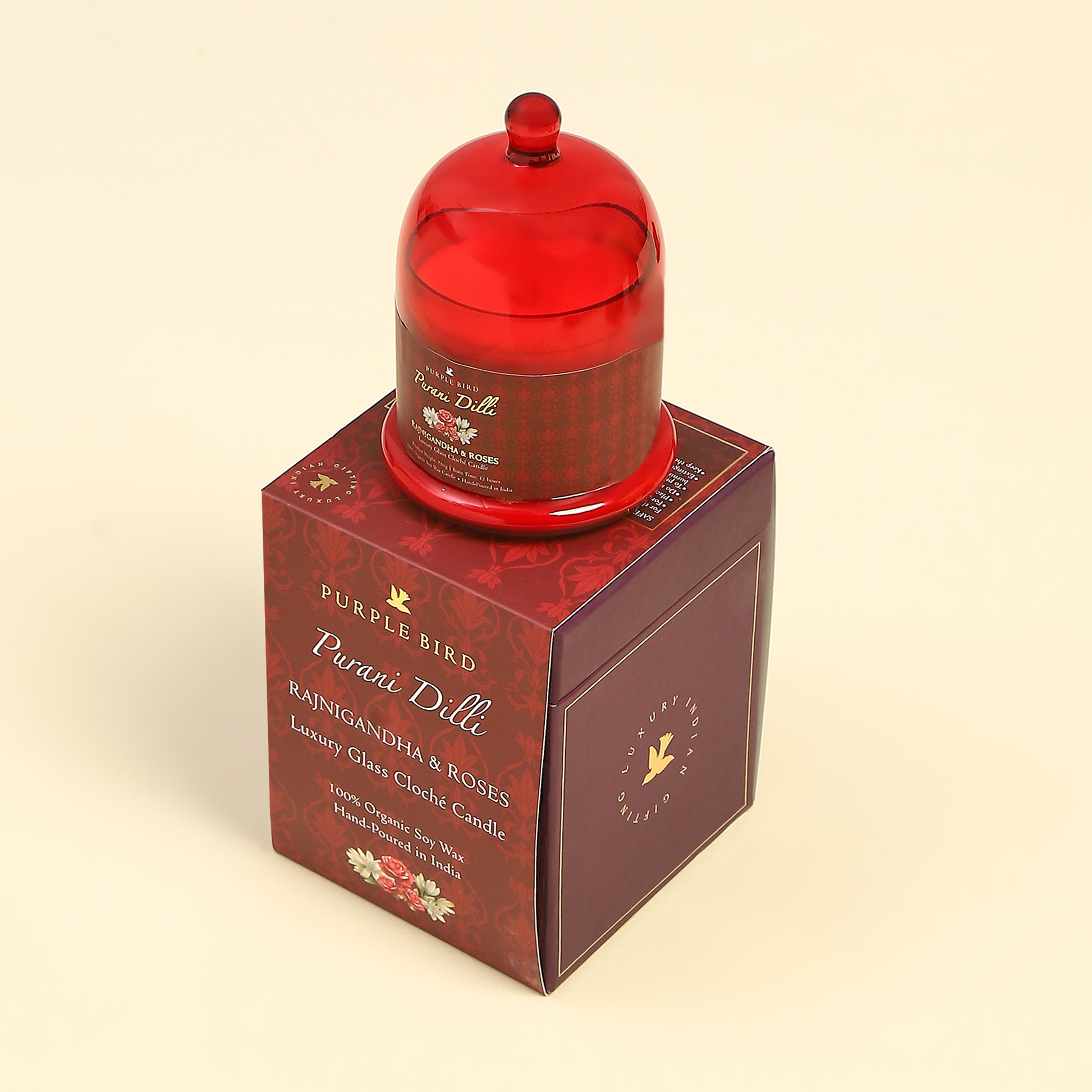 Purple Bird 'Purani Dilli' Luxury Glass Cloché Candle (Roses & Rajnigandha)