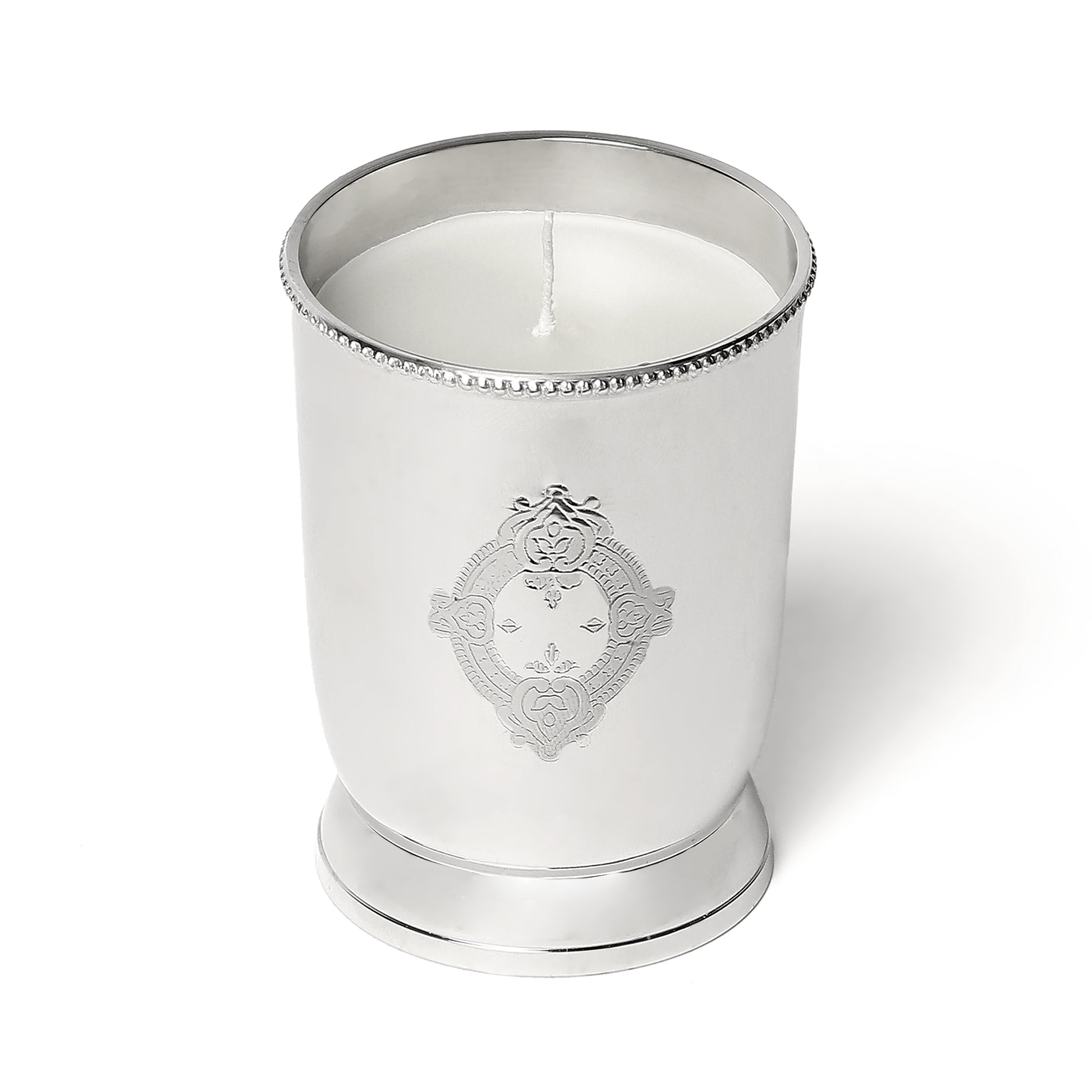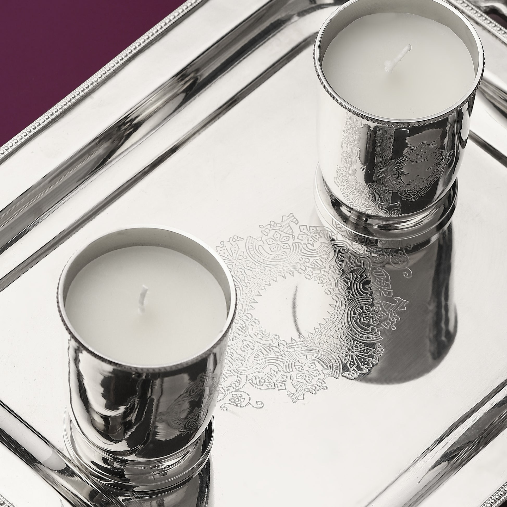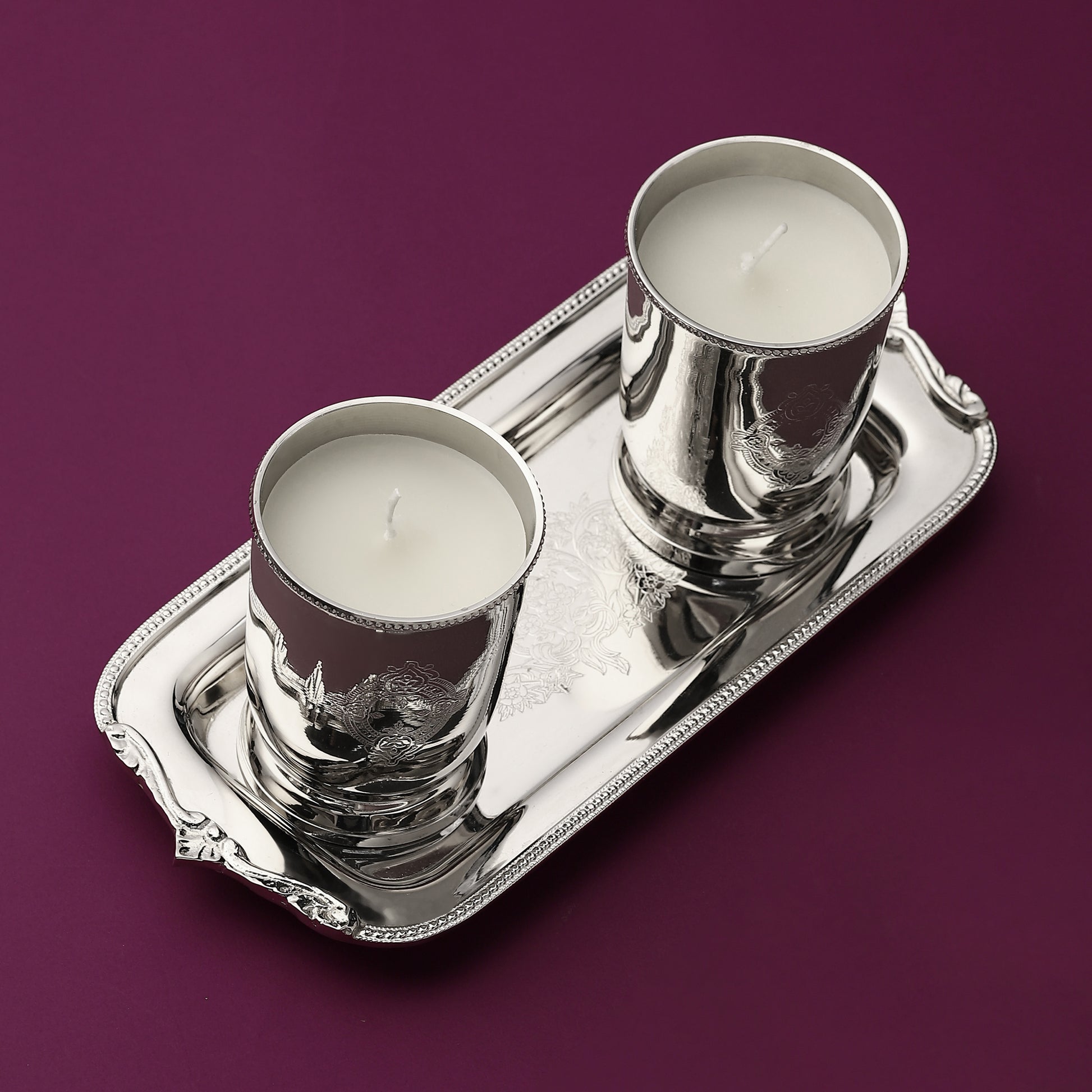 A set of two silver-plated candles with beautifully embossed crests, paired with a matching heavily embossed mini tray.