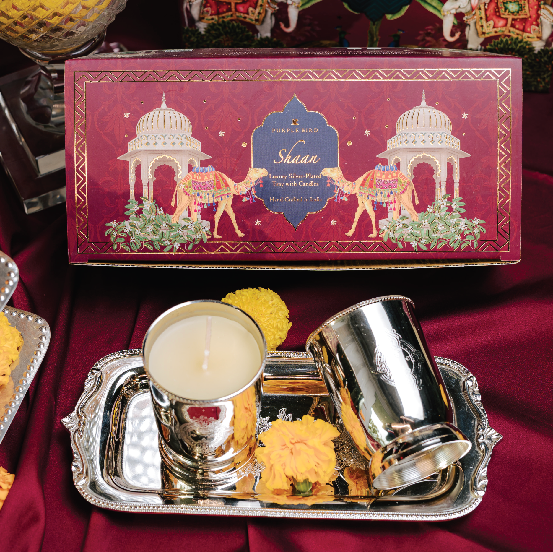 Purple Bird 'Shaan' Silver Plated Tray With Candles (Two Candles)