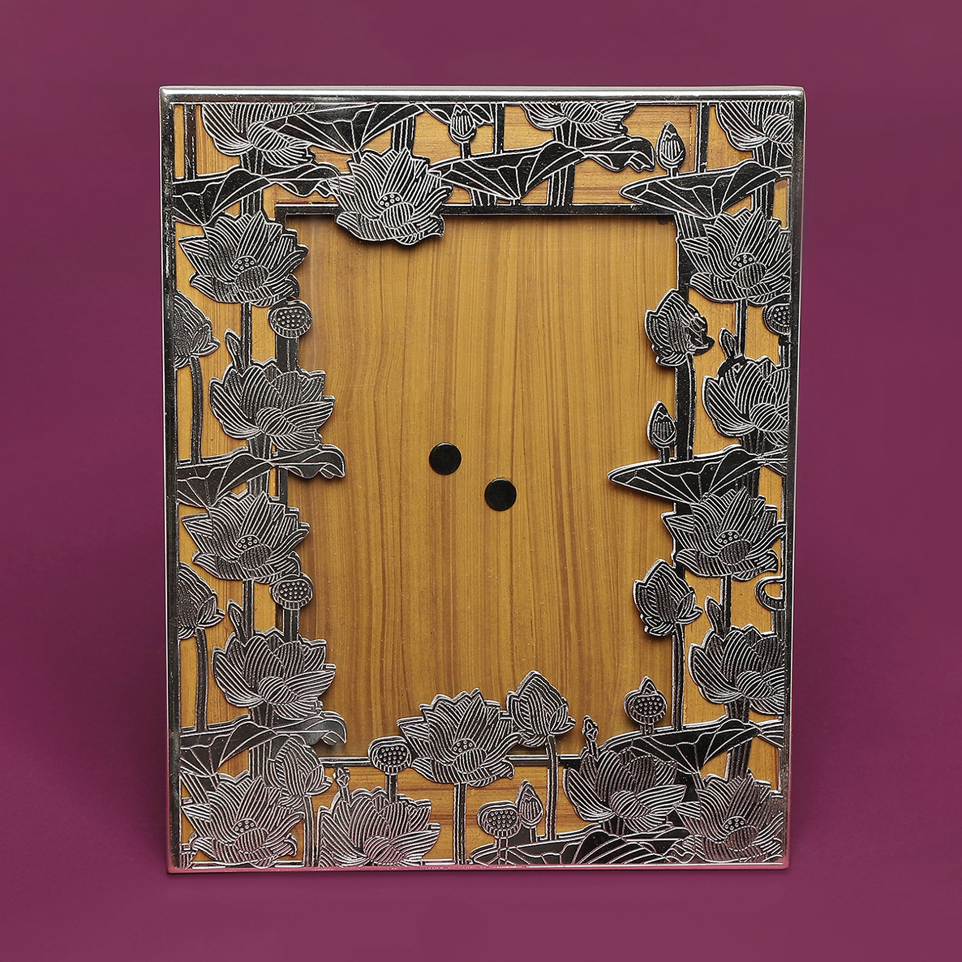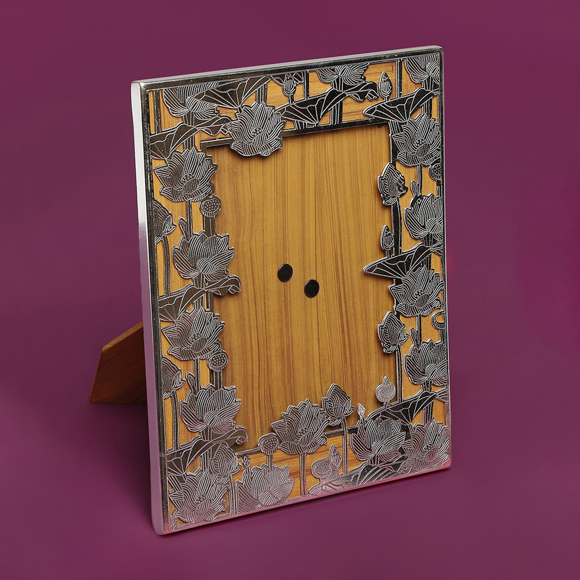 Capture your cherished moments in a masterpiece of craftsmanship. This exquisite silver-plated photo frame features an intricate cutwork design of a blooming lotus, symbolising purity and new beginnings. The delicate detailing is beautifully complemented by a rich wooden back for a touch of warmth and durability, while the glass front ensures your precious memories remain protected.