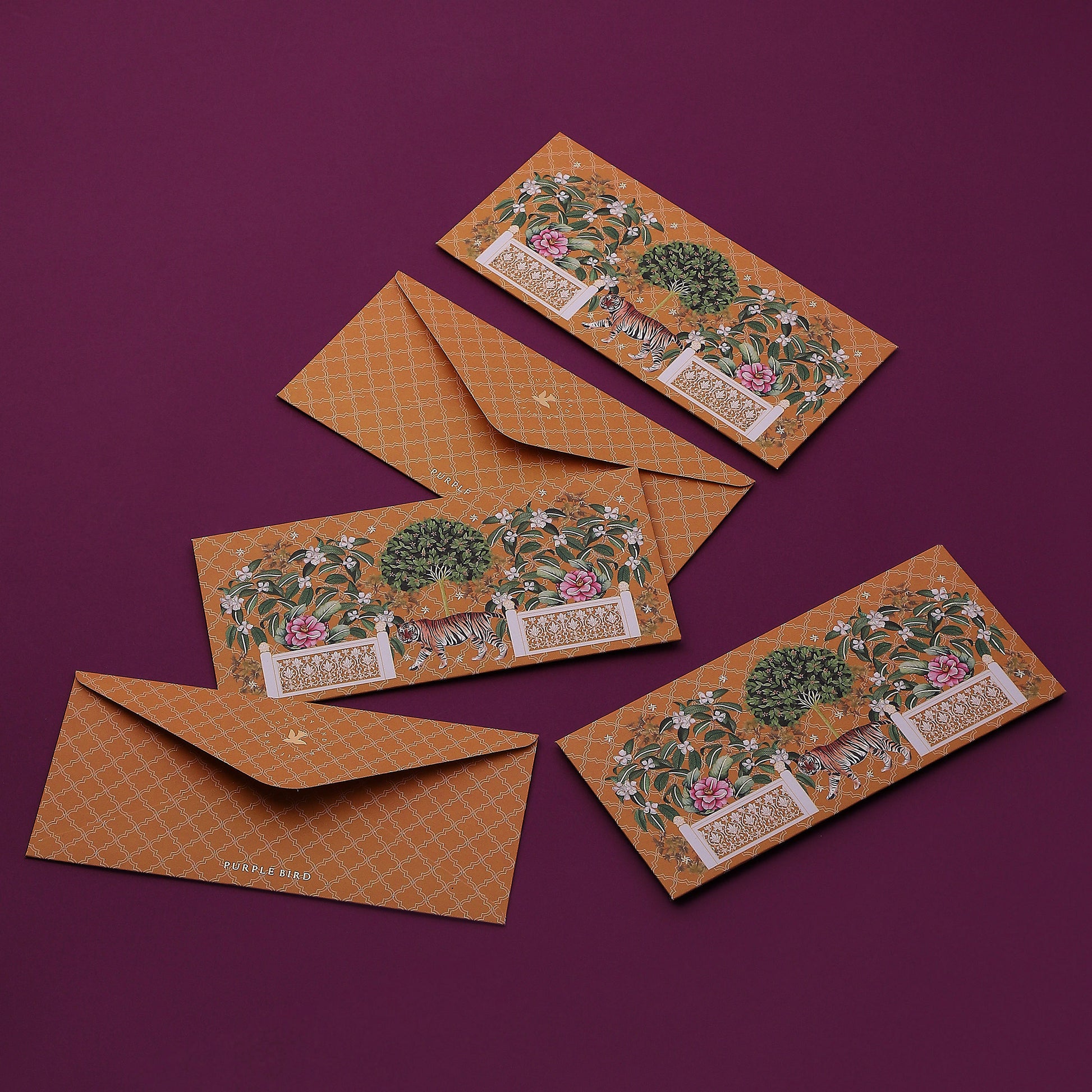 Guardian of Wealth: In the heart of this royal garden money envelope, the spirit of the royal Bengal tiger roars with regal authority. Embrace the power and grace of this majestic creature as you secure your treasures. A touch of the wild, a touch of royalty-let every currency note find its sanctuary in the embrace of the jungle's sovereign.