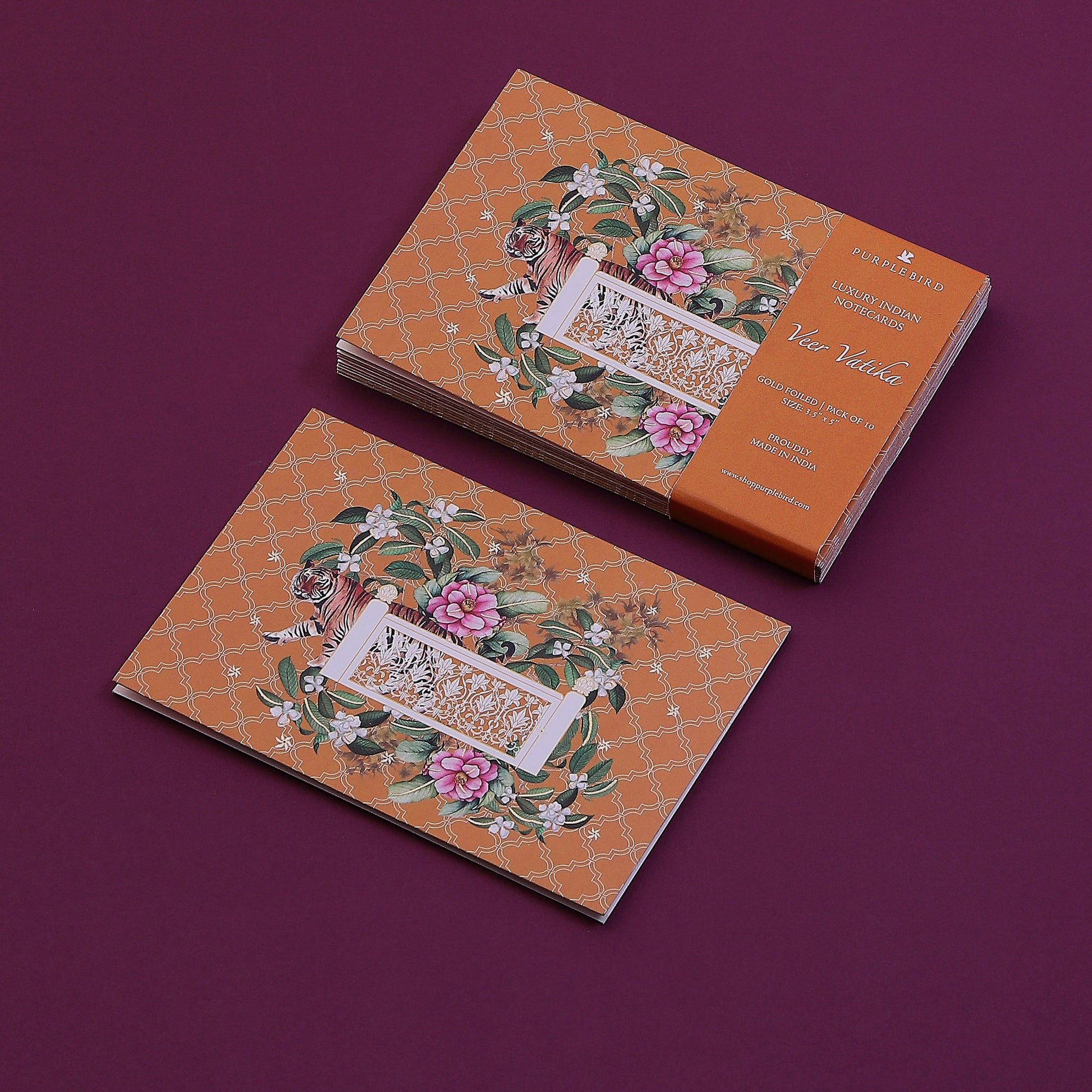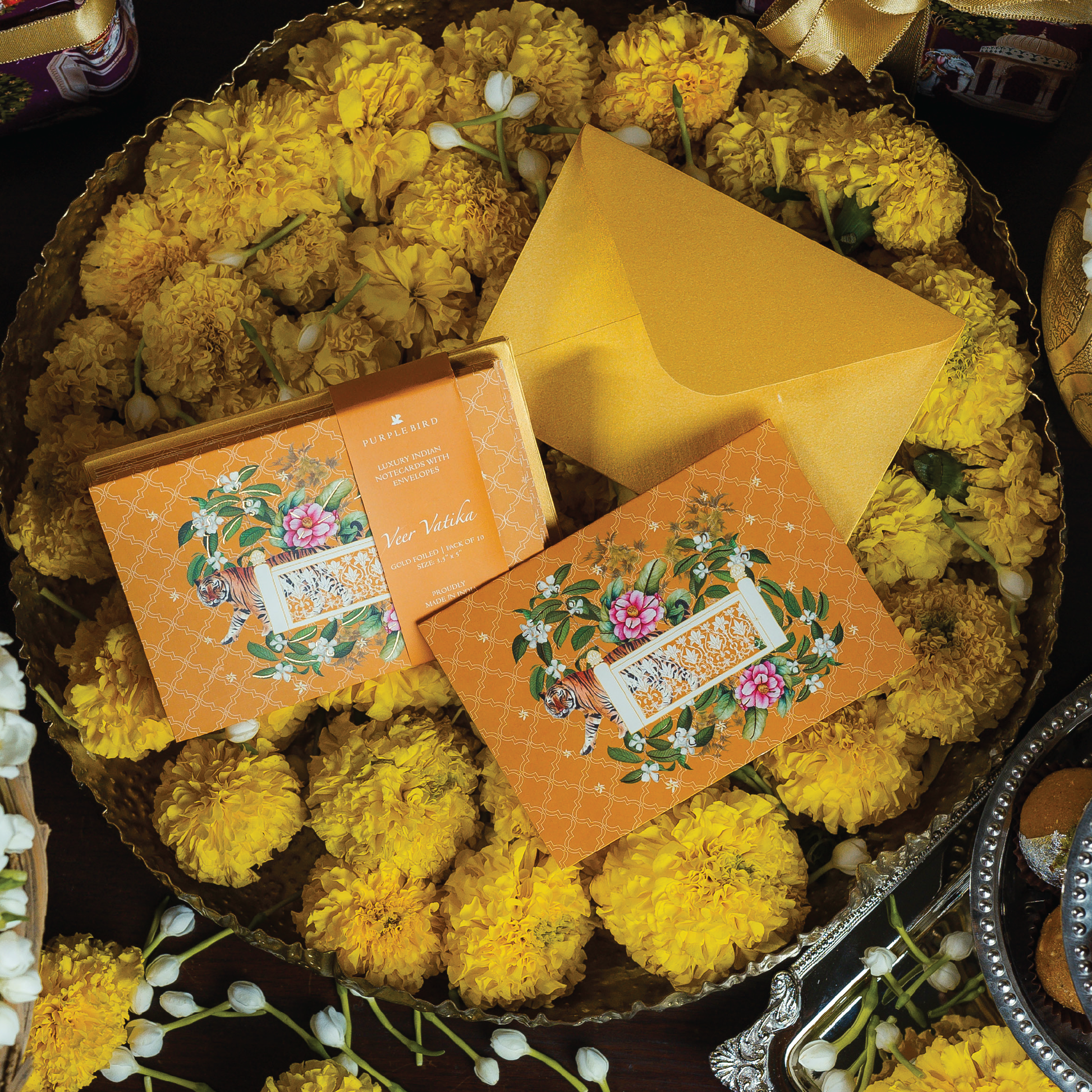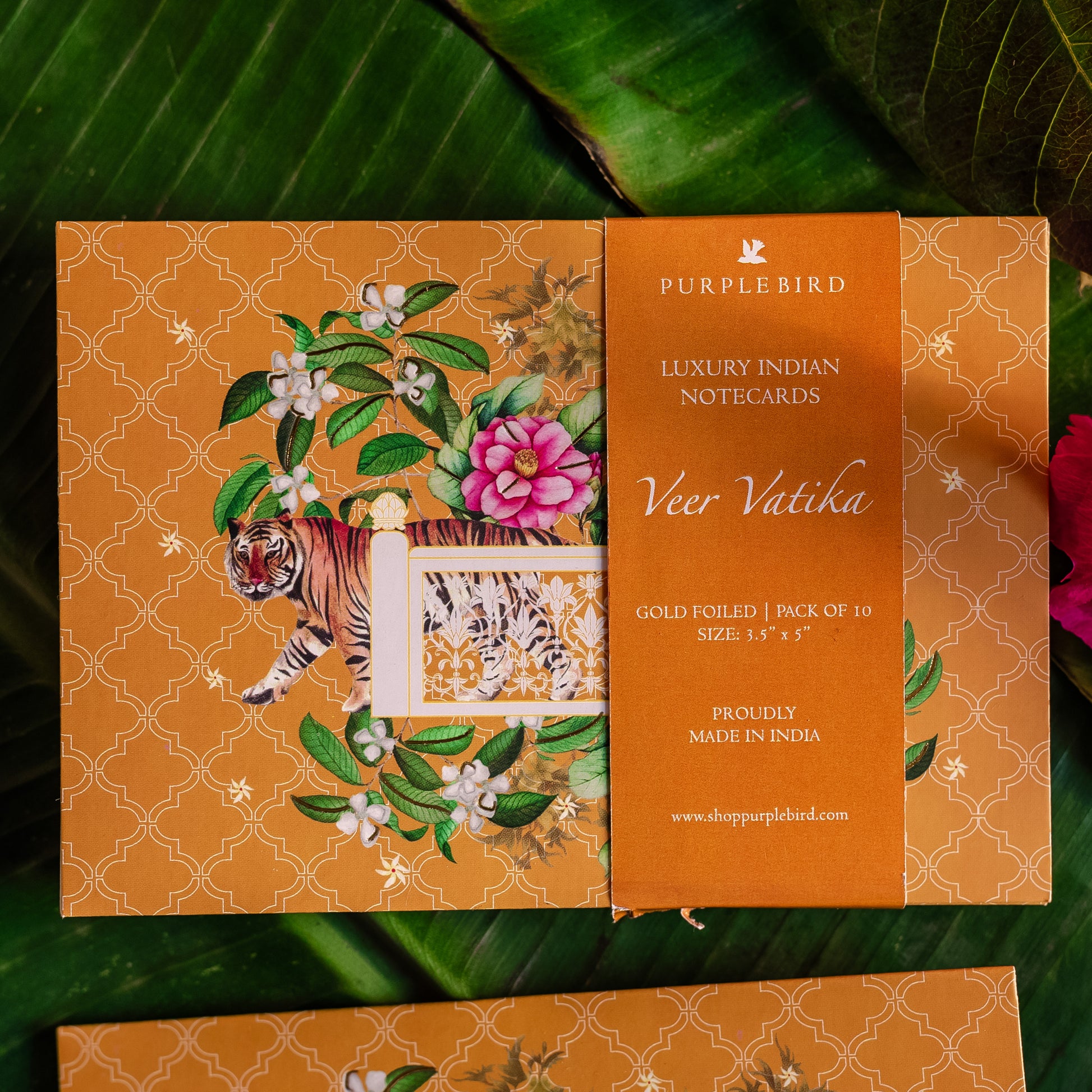 Veer Vatika celebrates the strength of the majestic royal Bengal tiger, as it moves stealthily across palace gardens, amidst lush quintessential Indian flora, including guava trees and their beautiful white flowers in full bloom. Send your messages with the strength and majesty of the jungle's sovereign. Each word resonates amidst the foliage, capturing the essence of the wild. Let your correspondence embody the royal tales of this magnificent creature.