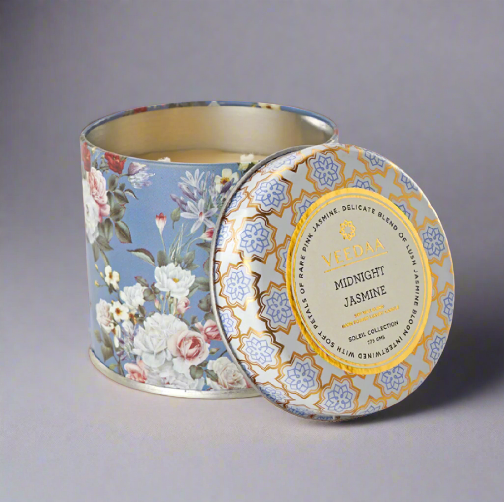 A delicate blend of lush jasmine bloom intertwined with soft petals of rare pink jasmine. Filled with clean-burning soy wax blend, these regal metallic tins are a gorgeous addition to any room. Timeless in beauty and scent rich jewel tones adorn this floral & contemporary mosaic design metallic option.